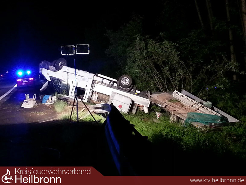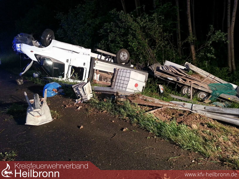 Am Freitagnacht, gegen 21.00 Uhr kam ein Ford Transit mit Anhänger auf der BAB 81, zwischen den Anschlussstellen Möckmühl und Osterburken, auf der Richtungsfahrbahn Würzburg, aus bislang unbekannter Ursache ins Schleudern. Das gesamte Gespann prallte zunächst leicht links gegen 6 Leitplankenelemente und beschädigte diese. Die Fahrzeugkombination wurde dann abgewiesen und prallte rechts erneut in 7 weitere Leitplankenelemente. Hierbei überschlug sich die Fahrzeugkombination und blieb auf dem Dach im Grünstreifen liegen.