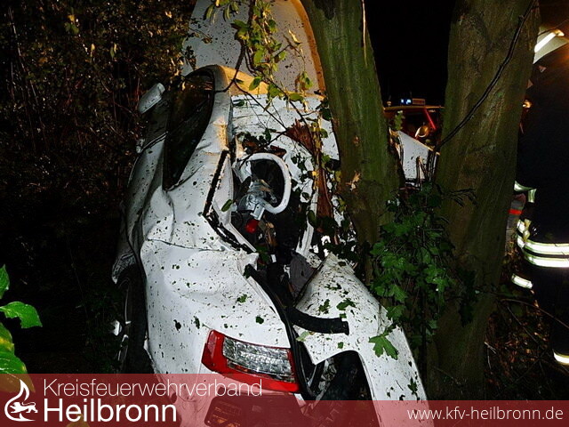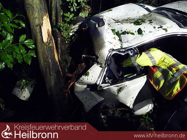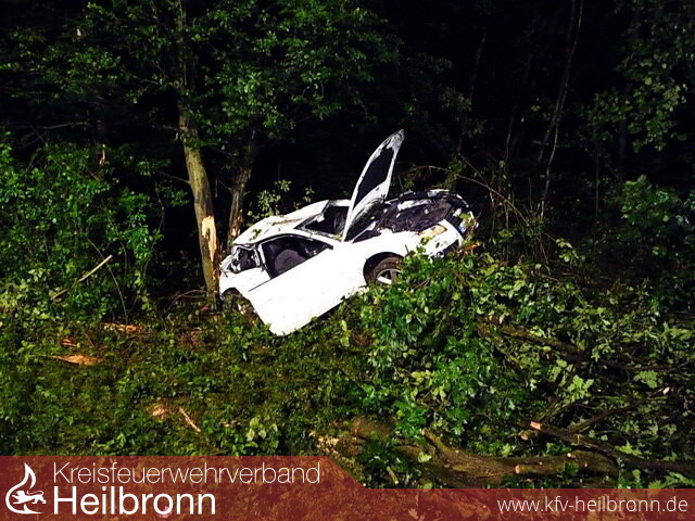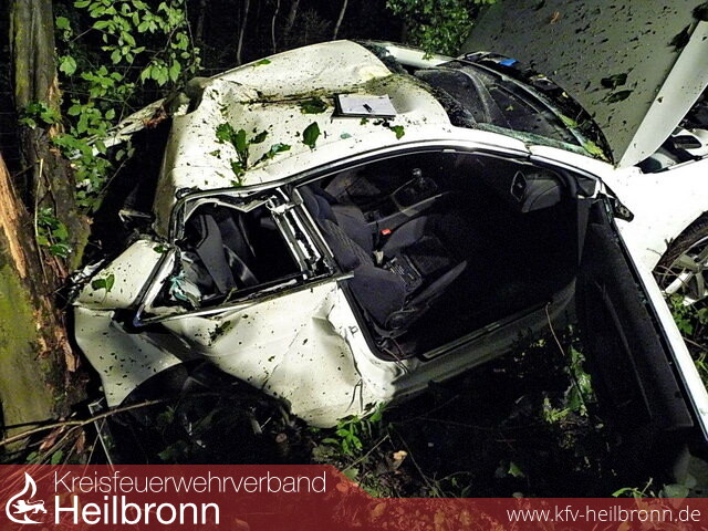 Während der Mercedes in einen Gehölzstreifen schleuderte und der Fahrer nahezu unverletzt aus dem Fahrzeug steigen konnte, prallte der Audi A5, welcher mit drei Personen besetzt war, gegen einen Baum, entwurzelte diesen und prallte mit dem Heck auf einen weiteren Baum.