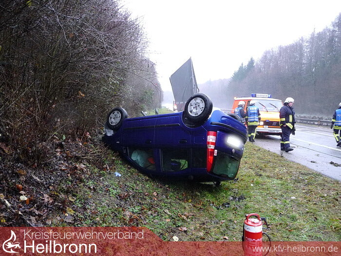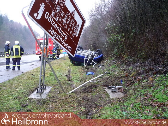 Dort kam, zwischen der Jagsttalraststätte West und der AS Möckmühl, ein 71-jähriger Fahrzeuglenker aus nicht geklärter Ursache nach rechts von der Fahrbahn ab, kollidierte mit einem Hinweisschild und überschlug sich mehrfach.