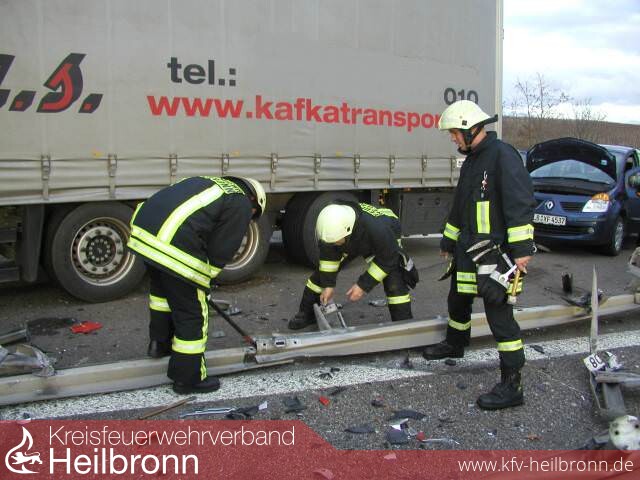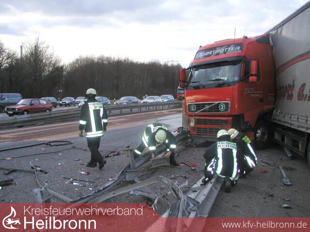 Vor Ort stellte sich heraus, dass ein Sattelzug an der AS NSU in Fahrtrichtung Mannheim die Mittelleitplanken auf eine Länge von ca. 150m niedergewalzt hatte.
