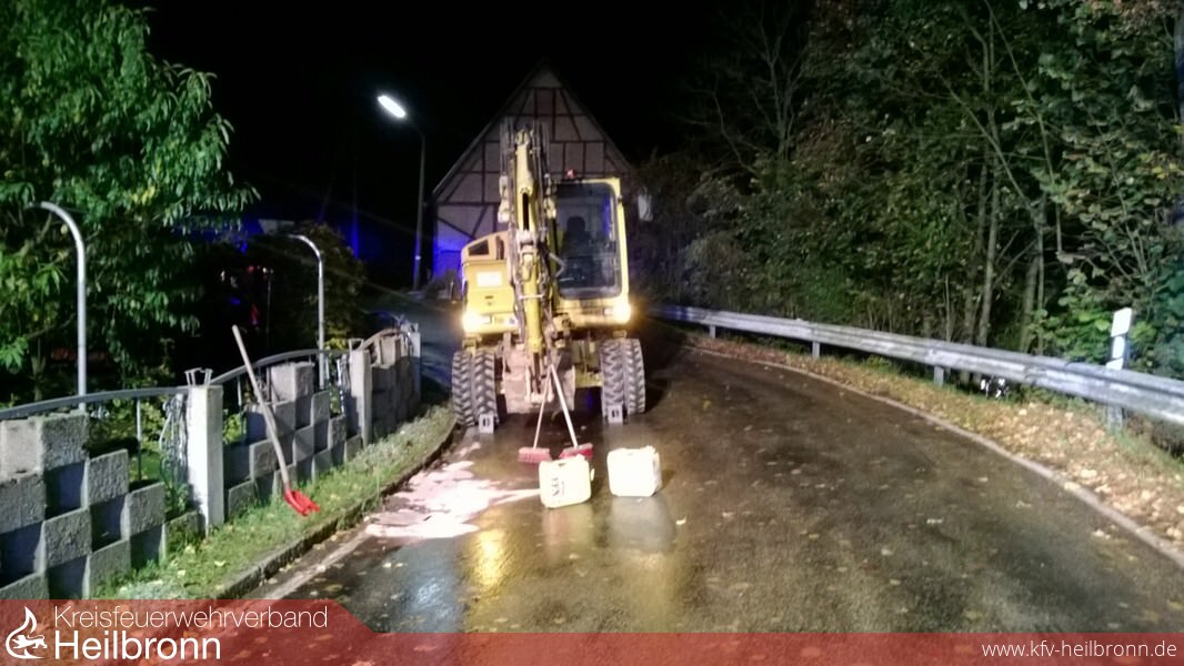 Aufgrund eines Lecks trat im Motorraum eines Baggers Hydrauliköl aus. Das Öl geriet auf den heißen Oberflächen des Motors in Brand, woaraufhin der Baggerfahrer sein Gefährt stoppte und die Feuerwehr verständigte. Mit zwei Eimern Wasser gleang es dem Baggerfahrer den Brand selbst zu löschen. Die eintreffende Feuerwehr stellte den Brandschutz sicher und nahm das ausgelaufene Öl auf. Dennoch war zuvor schon Hydrauliköl in einen Straßenschacht geraten, weshalb der Bereitschaftsdienst der Abwasserbeseitigung (HVG) verständigt wurde. Von dort aus konnte aber schließlich Entwarnung gegeben werden. Bei der Kontrolle weiterer Schächte konnte kein Öl in der Kanalisation festgestellt werden.