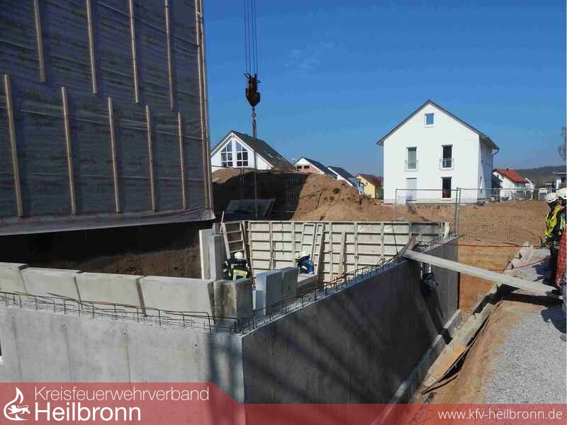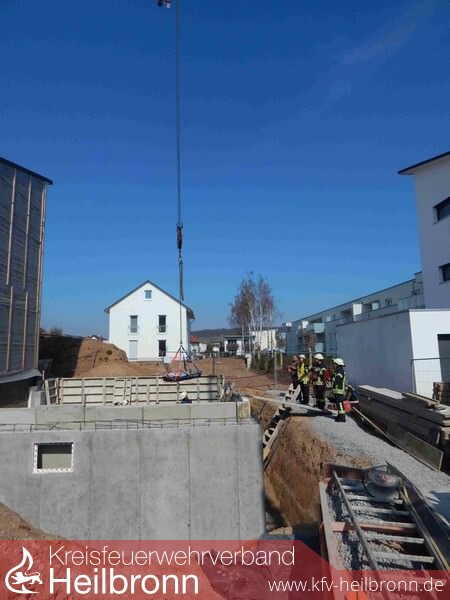 Aufgrund der baulichen Situation war es dem bereits anwesenden Rettungsdienst nicht möglich, den Verletzten mittels Krankentrage aus dem Kellerrohbau zu transportieren.