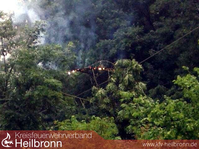 Nach einem starken Gewittersturm, mit bis zu 20 Litern Niederschlag innerhalb weniger Minuten, stürzte die Krone eines mittelgroßen Baumes auf eine Oberleitung der Bahnstrecke Stuttgart-Würzburg.
