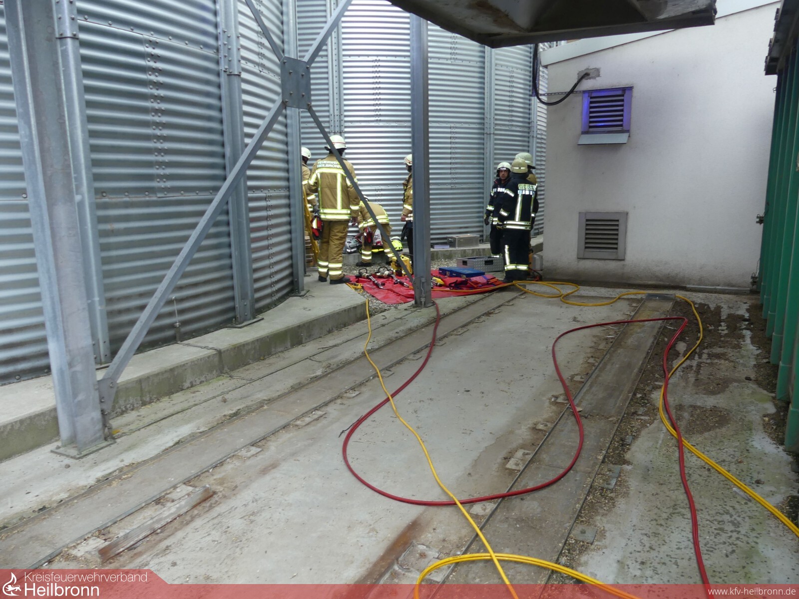Während der Erstversorgung des Verletzten durch den Rettungsdienst verhinderte die Feuerwehr das Nachrutschen des Lagermaterials und sorgte für ausreichend Luftzufuhr in dem Silo.