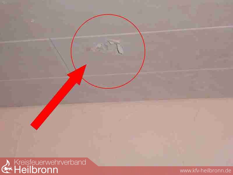 Der Einsatz hatte allerdings einen nennenswerten Aha-Effekt. Der anwesende Hausbewohner, der den Brand bemerkte und einen Pulverlöscher in Betrieb nehmen wollte, entging nur knapp einem schweren Unfall. Bei der Bedienung der Auslösevorrichtung vom Pulverlöscher (Bild 4) zerriss die Verschlussschraube und die CO²-Kartusche schoss senkrecht in die Raumdecke (Bild 5). Hätte sich der Anwender in diesem Moment über das Gerät gebeugt, Verletzungen hätten nicht verhindert werden können. Das Pulver (12 Kg) verteilte sich unkontrolliert im gesamten Wohnbereich.