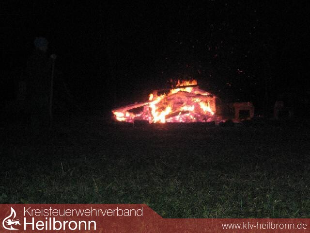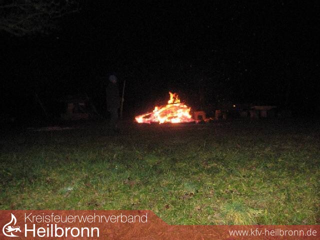 Tätigkeit: Da die Beschreibung zu beginn nicht eindeutig war, suchte die Feuerwehr zunächst den Bereich zwischen Brackenheim und Neipperg ab. Da die Anruferin über Ihre Handynummer bekannt war, konnte man rasch nachfragen und sich die genaue Einsatzstelle beschreiben lassen. Danach wurde auch rasch ein brennender Holzstapel (ca. 3 Meter Durchmesser und 1,5 Meter Höhe) gefunden. Der überraschte Betreiber dieser Feuerstätte verbrannte altes Holz. Da keine Gefahr für die Umgebung bestand, durfte das Feuer weiterbrennen. Die anwesende Polizei nahm die Personalien auf. Dem Betreiber wurde zur Auflage gemacht, nach vollständigem Abbrand der Leitstelle in Heilbronn bescheid zu geben.