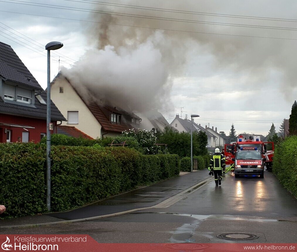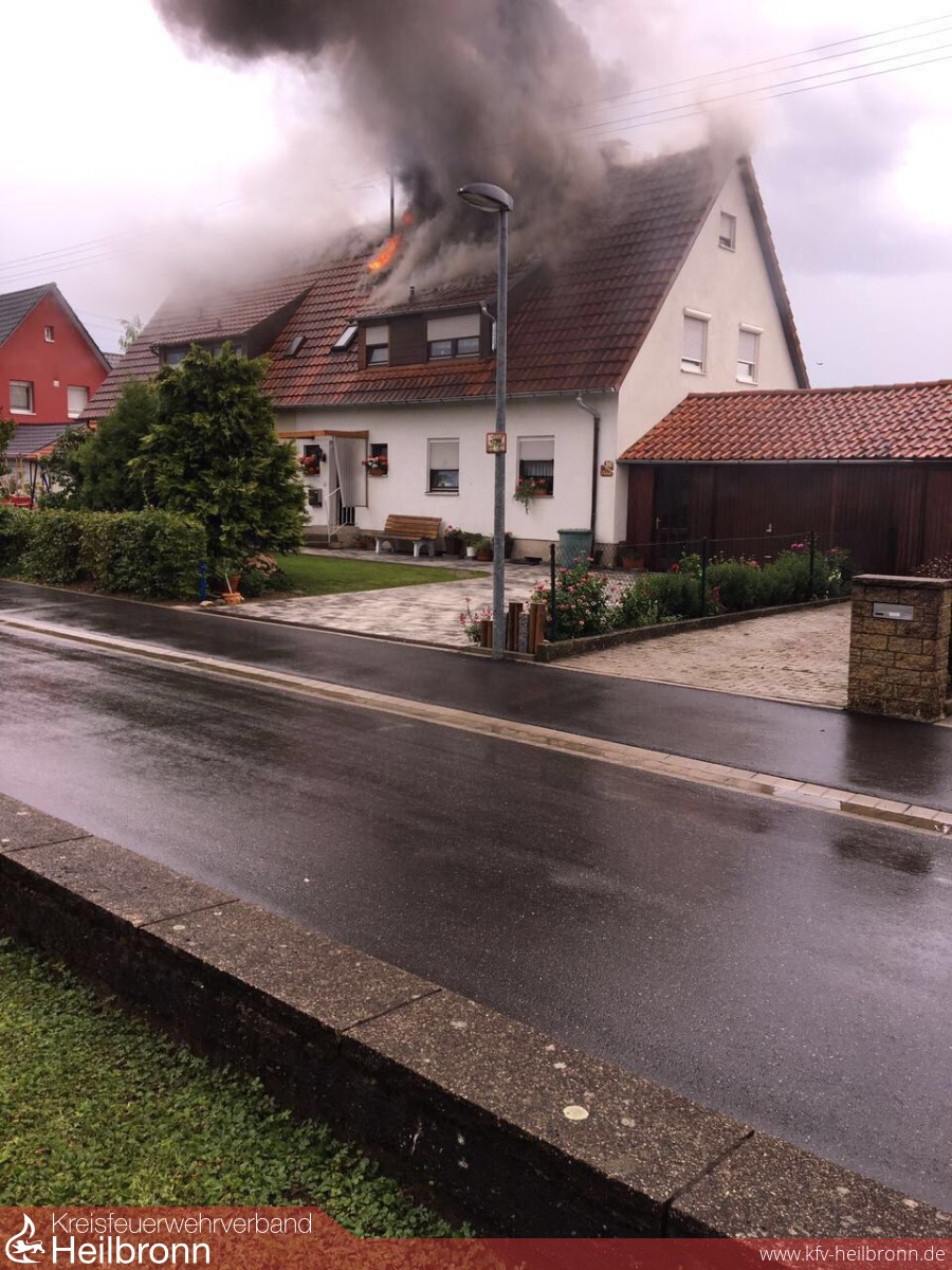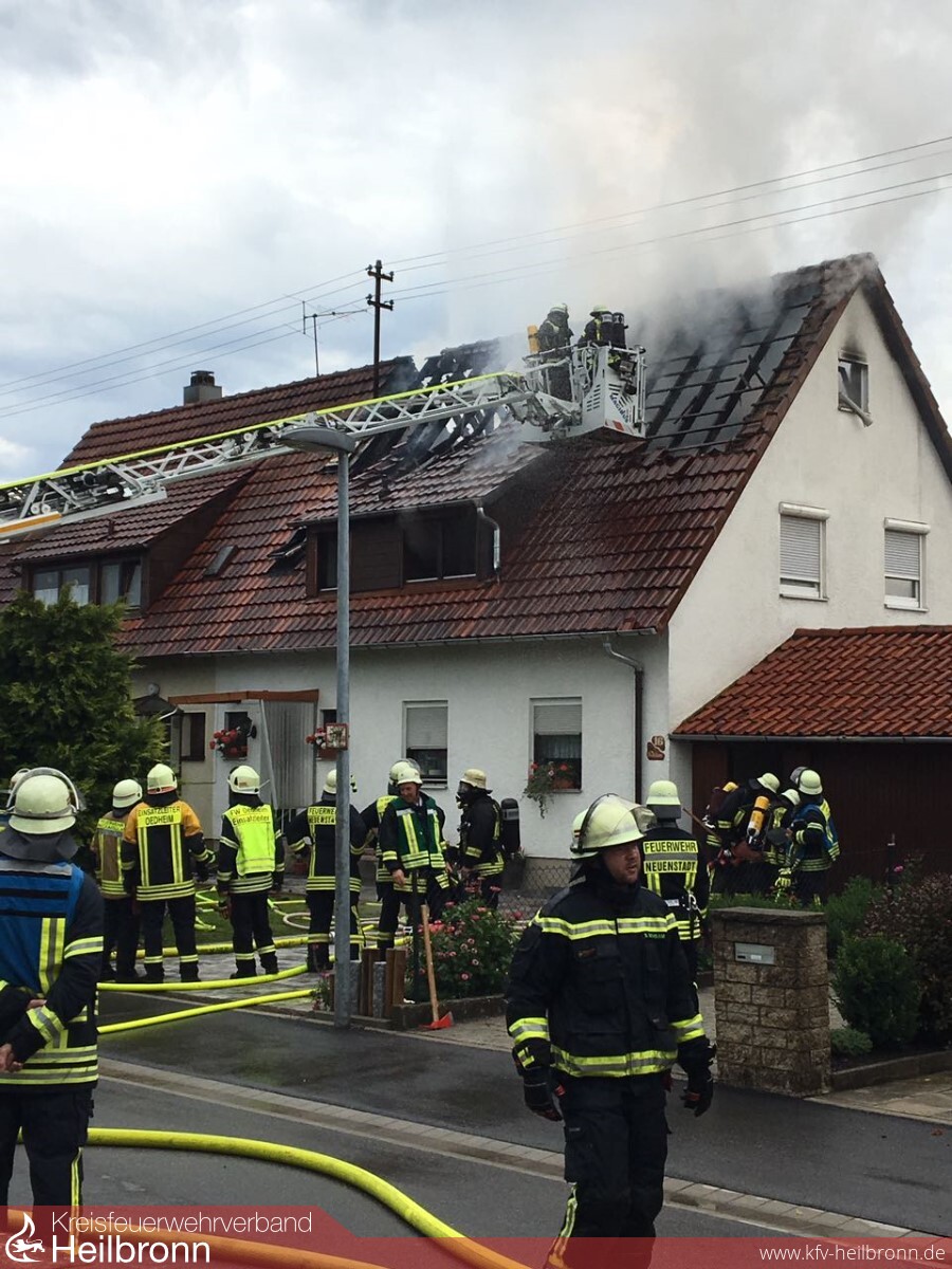 Die Feuerwehr Oedheim wurde am Montagnachmittag um 14:53 Uhr zu einem Dachstockbrand nach Blitzeinschlag in das Oedheimer Neudorf alarmiert. Bereits auf der Anfahrt konnten die anrückenden Kräfte eine starke Rauchentwicklung feststellen. Nachbarn, welche die Feuerwehr alarmierten, konnten die Bewohner auf den Brand im Dachgeschoss aufmerksam machen, so dass sich beim Eintreffen der Einsatzkräfte keine Personen mehr im Gebäude befanden. Da sich die Feuerwehr Bad Friedrichshall bereits in einem Einsatz befand, wurde von der Leitstelle Heilbronn der Löschzug der Feuerwehr Neckarsulm alarmiert. Die Feuerwehr Neckarsulm befand sich jedoch ebenfalls auf einer Einsatzfahrt nach Dahenfeld, so dass aus dem Löschzug nur einzelne Fahrzeuge herausgelöst werden konnten. Um den Löschzug mit weiteren Fahrzeugen zu vervollständigen, wurde die Feuerwehr Neuenstadt zur Überlandhilfe nach Oedheim alarmiert.