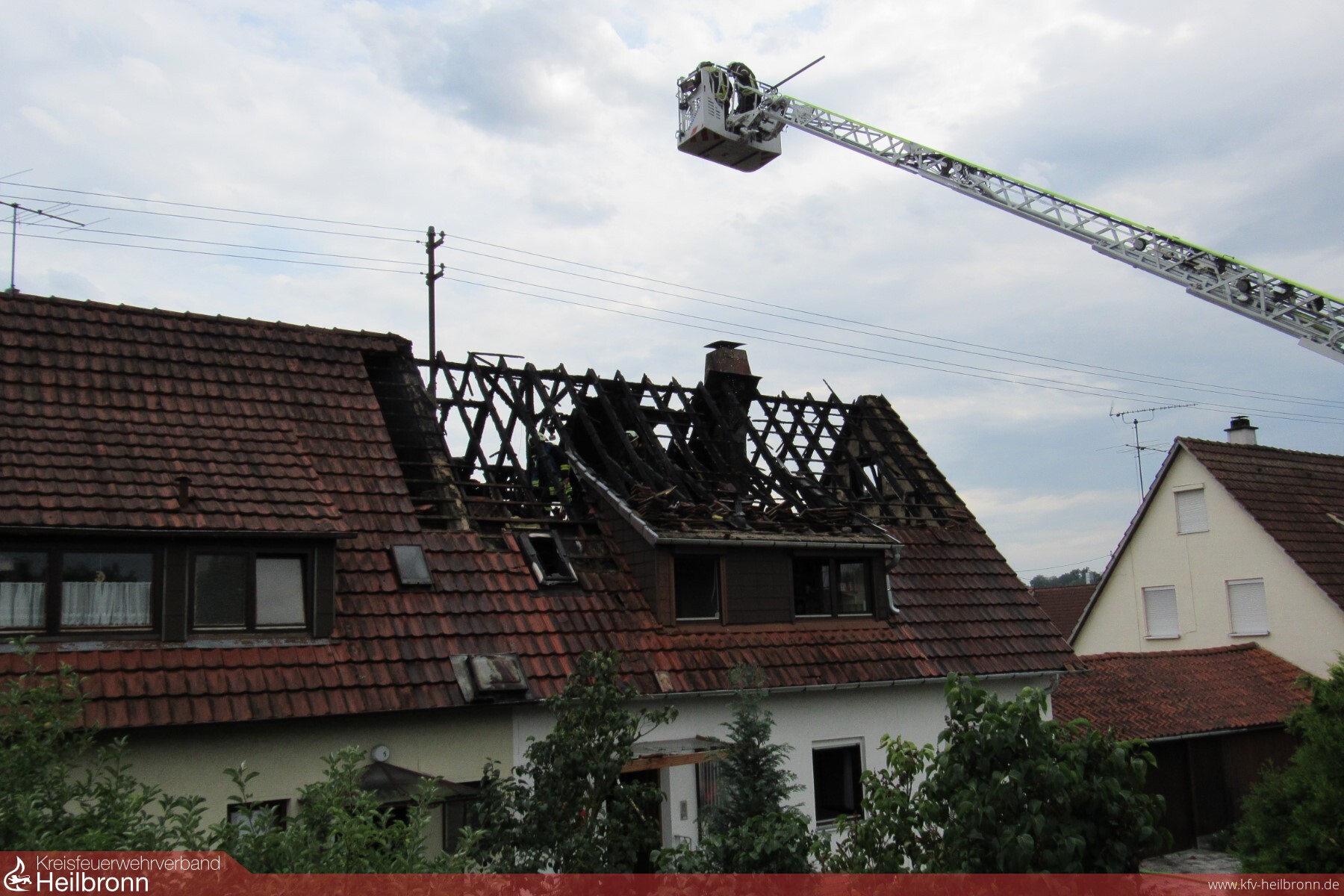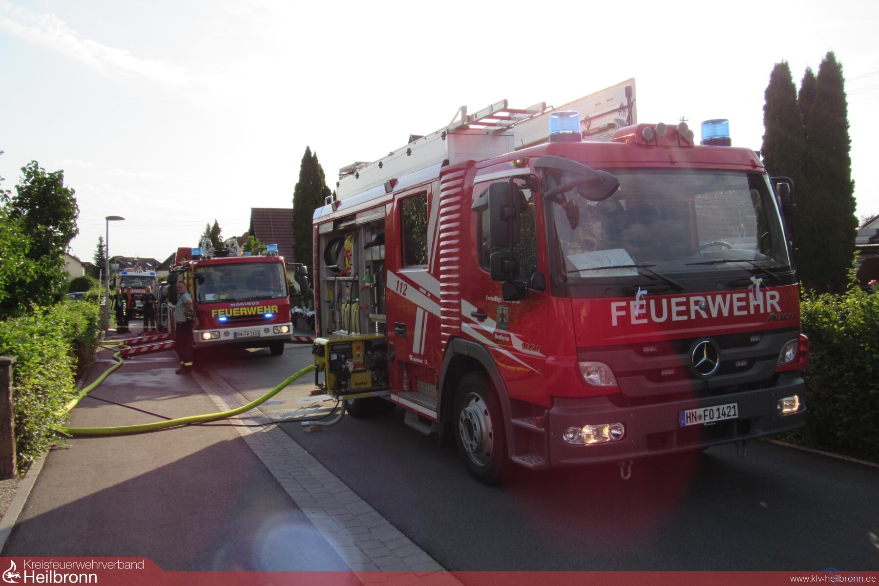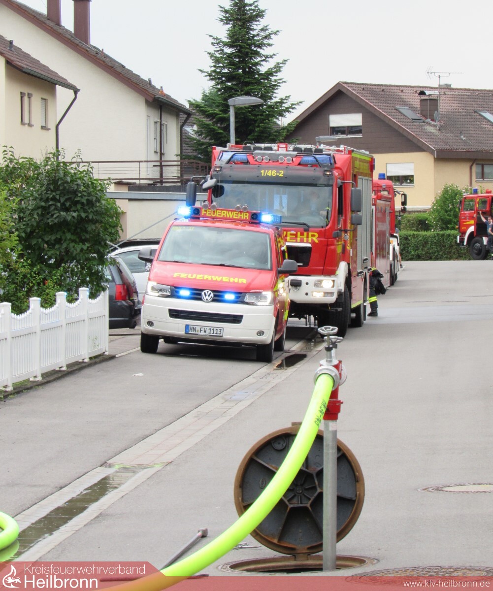 Die Feuerwehr Oedheim wurde am Montagnachmittag um 14:53 Uhr zu einem Dachstockbrand nach Blitzeinschlag in das Oedheimer Neudorf alarmiert. Bereits auf der Anfahrt konnten die anrückenden Kräfte eine starke Rauchentwicklung feststellen. Nachbarn, welche die Feuerwehr alarmierten, konnten die Bewohner auf den Brand im Dachgeschoss aufmerksam machen, so dass sich beim Eintreffen der Einsatzkräfte keine Personen mehr im Gebäude befanden. Da sich die Feuerwehr Bad Friedrichshall bereits in einem Einsatz befand, wurde von der Leitstelle Heilbronn der Löschzug der Feuerwehr Neckarsulm alarmiert. Die Feuerwehr Neckarsulm befand sich jedoch ebenfalls auf einer Einsatzfahrt nach Dahenfeld, so dass aus dem Löschzug nur einzelne Fahrzeuge herausgelöst werden konnten. Um den Löschzug mit weiteren Fahrzeugen zu vervollständigen, wurde die Feuerwehr Neuenstadt zur Überlandhilfe nach Oedheim alarmiert.