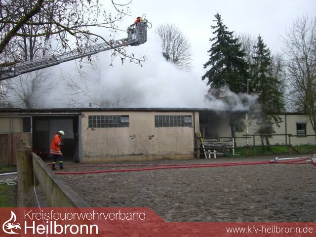 Der Mann aus der Wohnung wurde aus dem Haus in das Hauptgebäude des Altersheim gebracht. Die Pferde wurden von Betreuern weggebracht. Von zwei Trupps des Tanklöschfahrzeuges wurden unter Atemschutz zwei C- Rohre zur Riegelstellung von der Gebäudehauptseite vorgenommen. Die Drehleiter wurde zum Wenderohreinsatz eingesetzt, während vom Löschgruppenfahrzeug LF 16 ein Löschangriff und eine Riegelstellung mit einem C- und einem B- Rohr an der Gebäuderückseite gestartet wurde. Der Aufbau der Wasserversorgung erfolgte durch die Mannschaft des Rüstwagens und der beiden Löschfahrzeuge der Abteilungen Duttenberg und Untergriesheim, welche auch die Atemschutz- Reservetrupps stellten. Ein Übergreifen des Feuers auf das Wohngebäude und das Stallgebäude konnte verhindert werden.