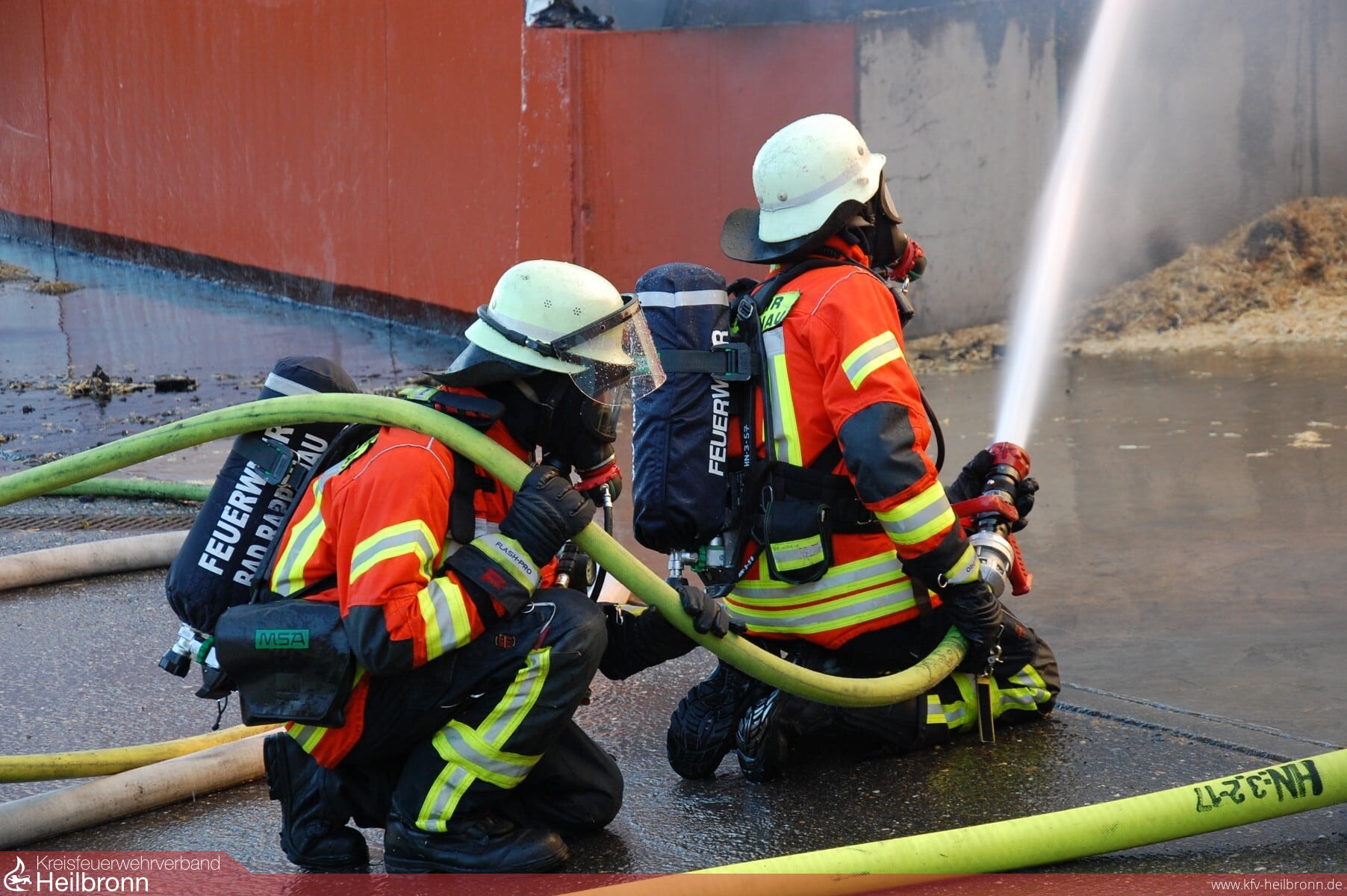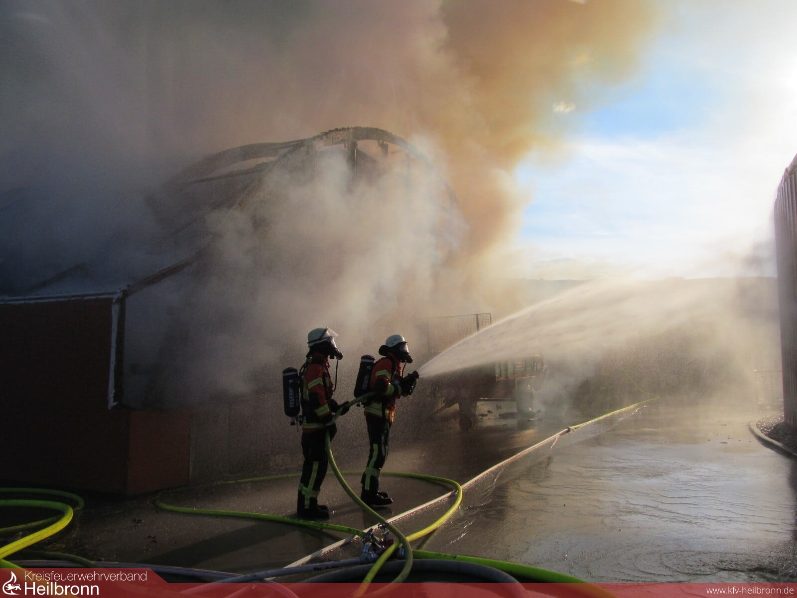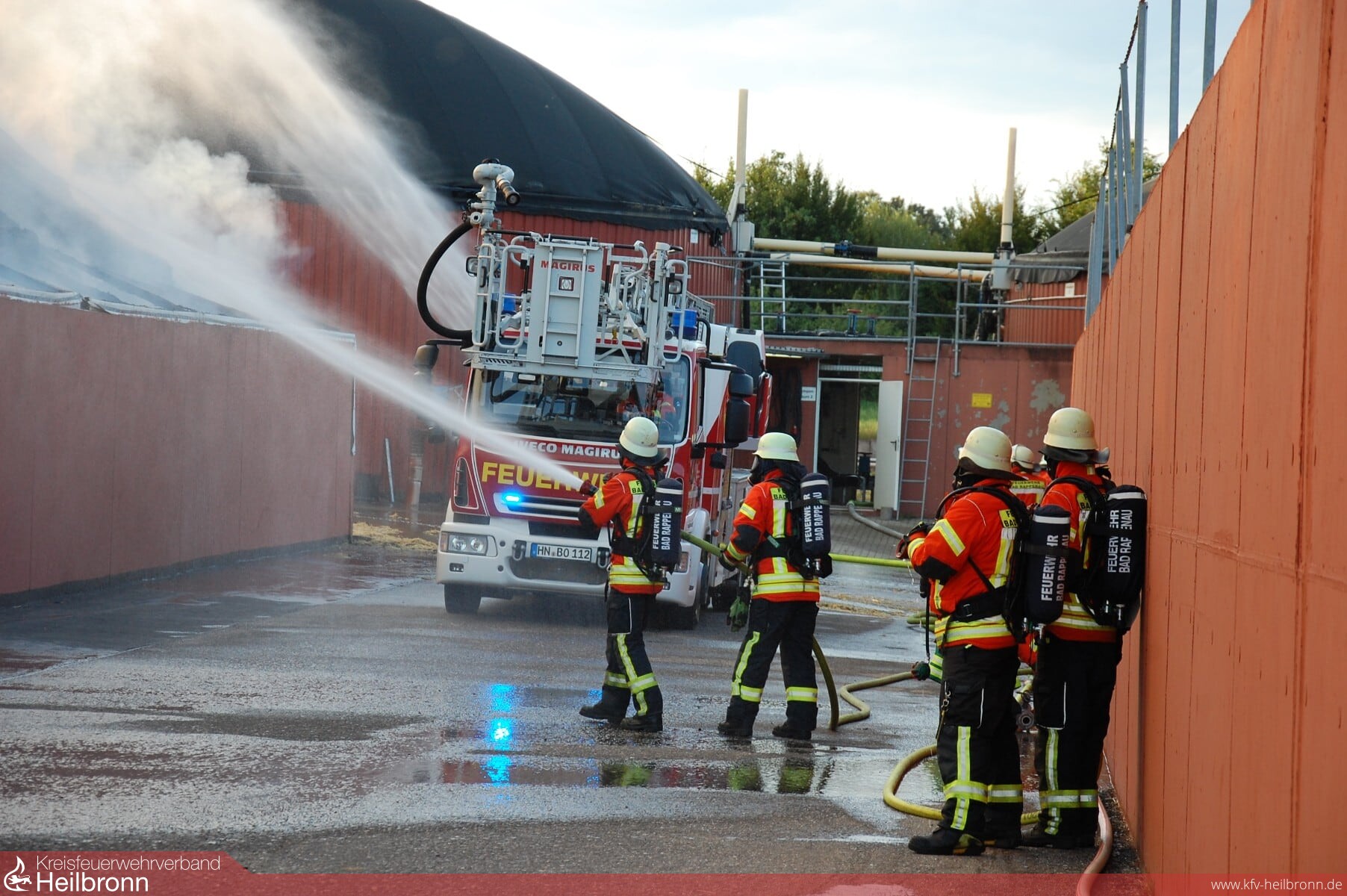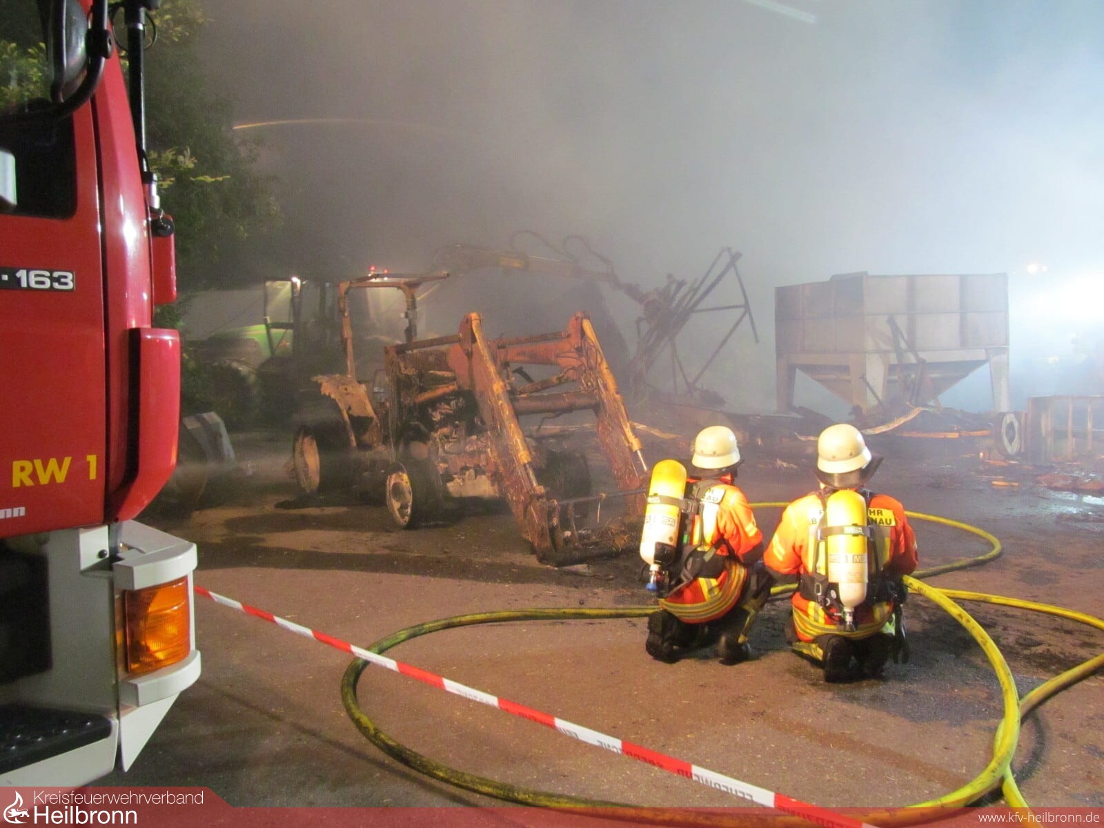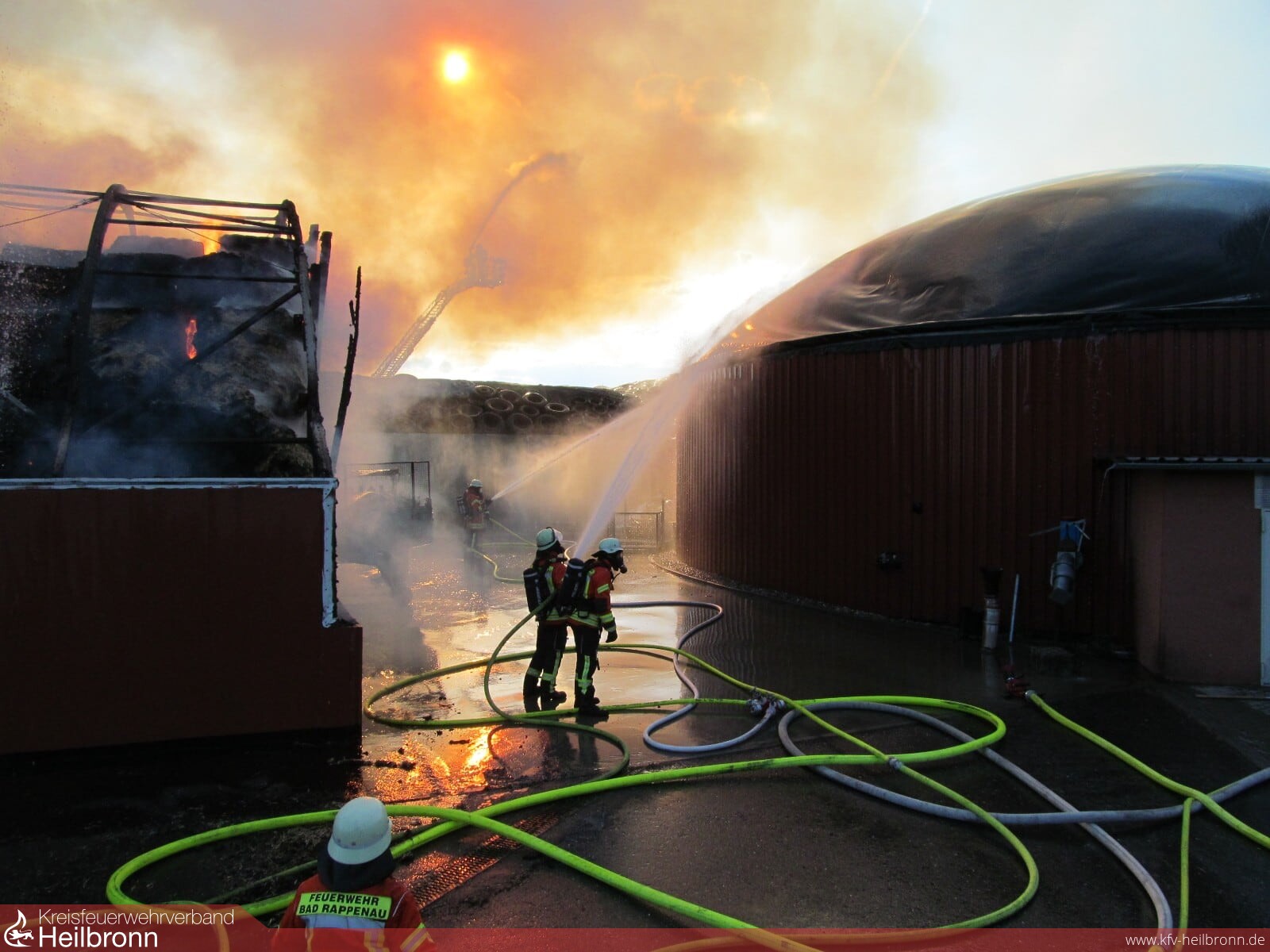 Beim Eintreffen der ersten Einsatzkräfte stand eine Strohlagerhalle im Vollbrand. Um eine Schädigung des angrenzenden Fermenters einer Biogasanlage zu verhindern wurde dieser sofort mittels Wasserwerfer und Wenderohren gekühlt. Gleichzeitig wurde die Brandbekämpfung eingeleitet. Zur Sicherung der Wasserversorgung während des Einsatzes legte der Wasserförderungszug der Feuerwehr Bad Rappenau zwei Leitungen mit einer Länge von jeweils einem Kilometer nach Bad Rappenau zum nächsten Hydranten. Zwischenzeitlich waren zusätzlich zu den eingesetzten Wenderohren und Wasserwerfern 5 C-Rohre im Einsatz, um das Feuer unter Kontrolle zu bekommen. Auch die Feuerwehr Bad Wimpfen, Neckarsulm und die Berufsfeuerwehr Heilbronn haben mit Sondergerät, wie dem Abrollbehälter Atemschutz und dem Gerätewagen Messtechnik unterstützt. Der Neckarsulmer Gerätewagen Messtechnik untersuchte die Luft hinsichtlich möglicher Schadstoffverunreinigungen. Jedoch konnten weder in direkter Umgebung des Brandes noch in den angrenzenden Wohnbebauungen Schadstoffemissionen festgestellt werden.