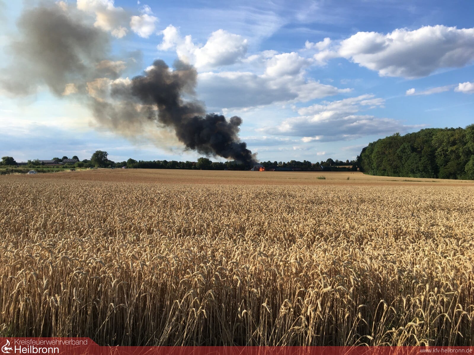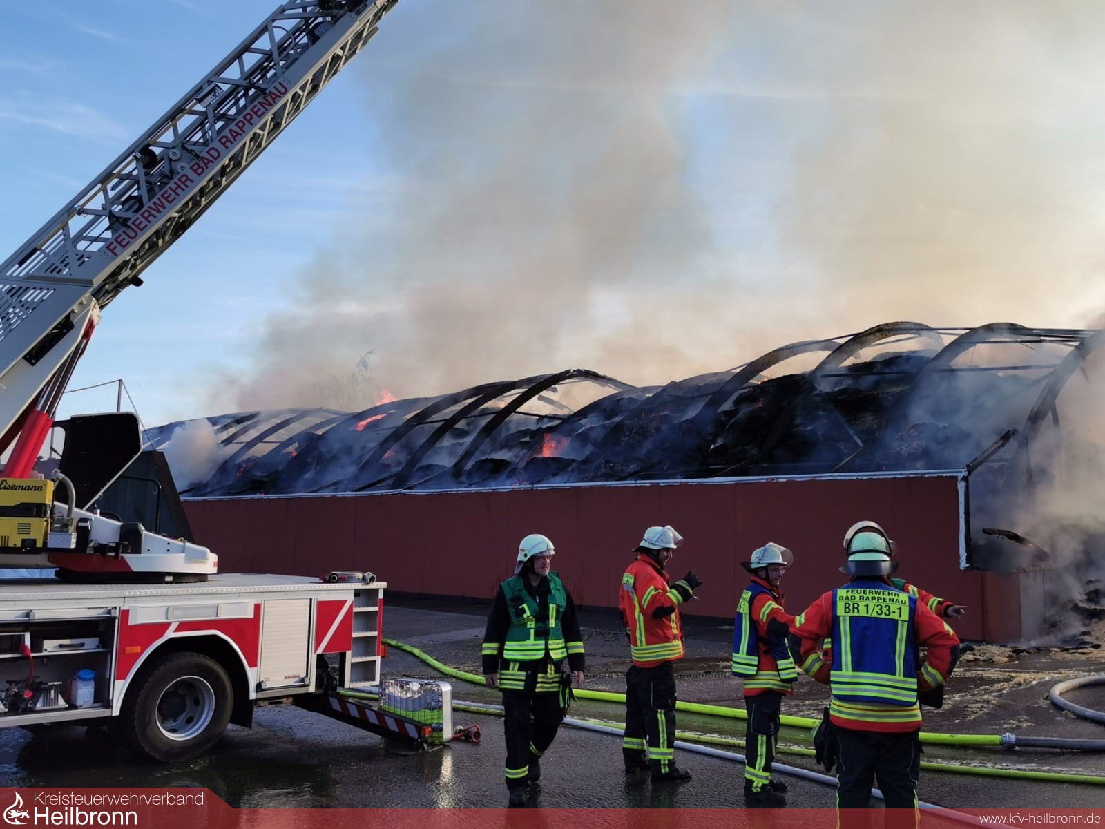 Mit dem Alarmstichwort „Brand Industriegebäude“ wurde die Freiwillige Feuerwehr Bad Rappenau am frühen Abend des 18. Juli auf ein Landwirtschaftliches Anwesen zwischen Bad Rappenau und Bonfeld alarmiert. Schon auf der Anfahrt der Einsatzkräfte zum Feuerwehrhaus war eine massive Rauchsäule am Horizont zu erkennen.