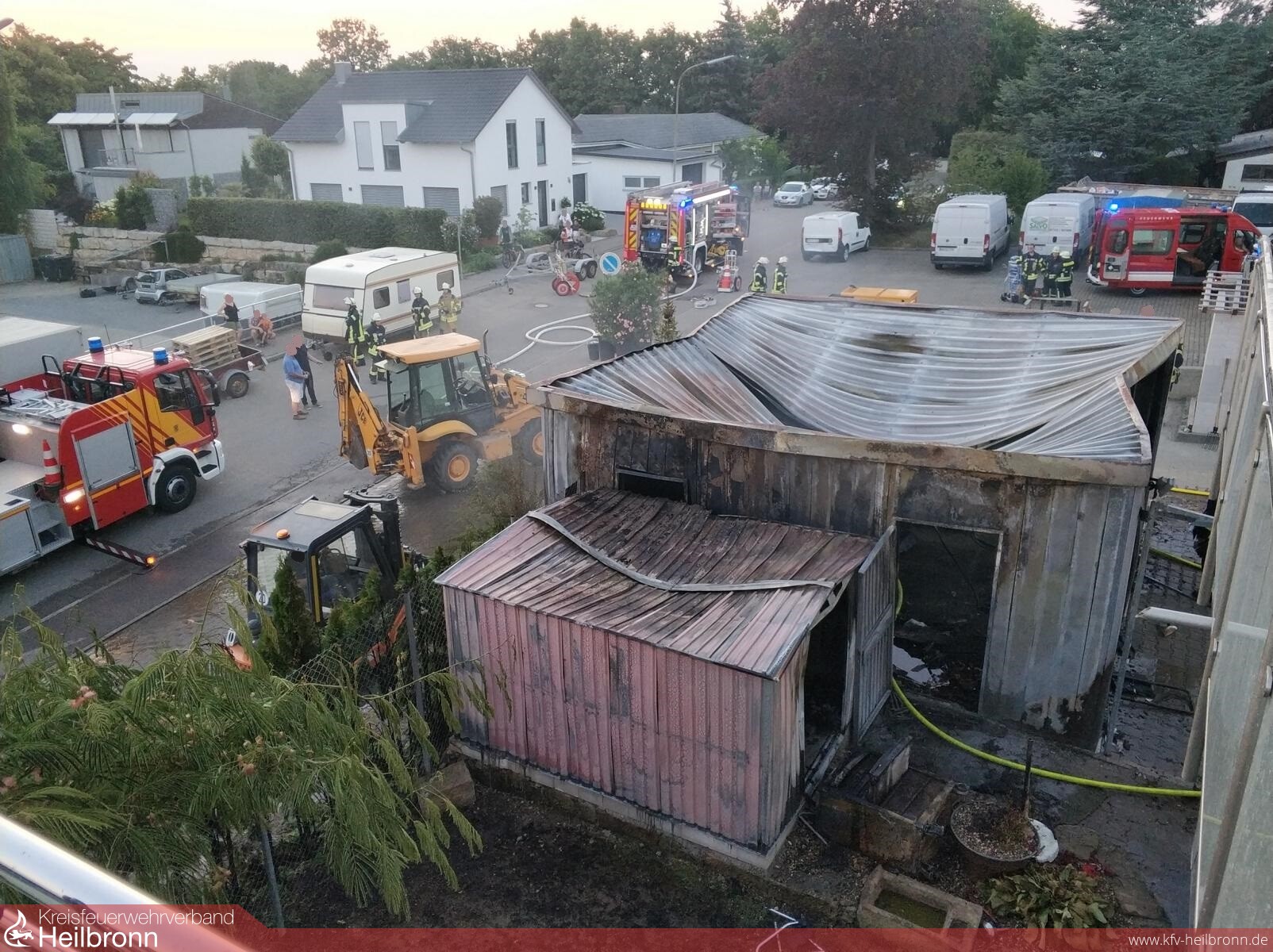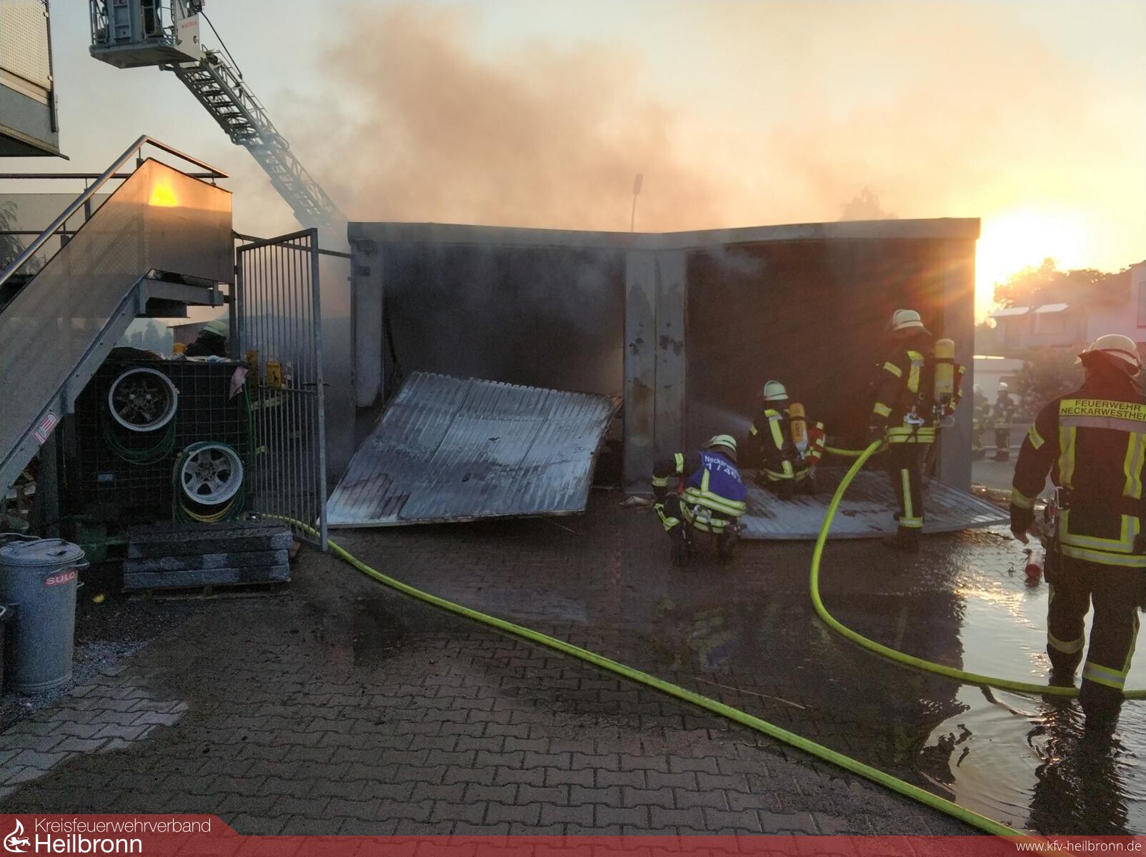 Am Freitagabend wurden die Feuerwehren Neckarwestheim und Lauffen zu einem Brand einer Doppelgarage und Geräteschuppens, der auf ein Gebäude überzugreifen drohte, alarmiert. Durch den Einsatzleiter wurde das angrenzende Gebäude geräumt und bei der Erkundung eine 11 kg Gasflasche in der brennenden Garage ausgemacht, welche durch abblasendes Gas die Temperaturen des Feuers in extreme Höhen trieb.