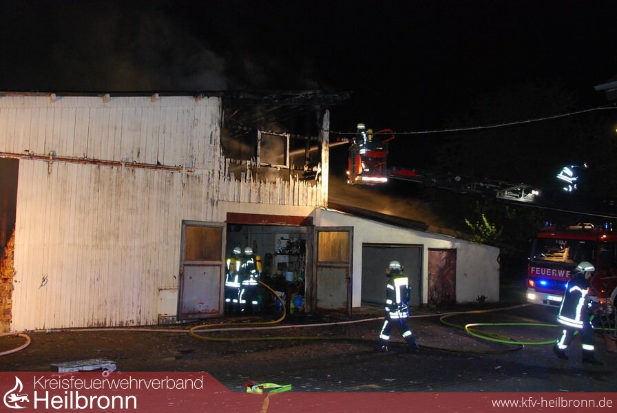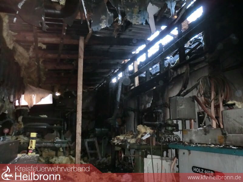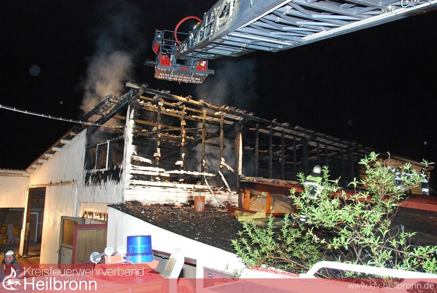 Ein Feuer ist um Mitternacht in einer Maschinenhalle mit angebauter Schreinerei ausge-brochen. Beim Eintreffen der Feuerwehr war der Dachbereich auf etwa 20 m Länge bereits im Vollbrand. Personen und Anwohner waren zu keiner Zeit akut gefährdet. Eine sofortige Riegelstellung zum Schutz eines angrenzenden Wohnhauses und ein massiver Löschangriff mit mehreren Rohren im Innen- und Außenangriff zeigten schnell ihre Wirkung. Der Brand wurde in der Spitzenzeit mit 8 Löschrohren bekämpft. Die Ausbreitung konnte sofort eingedämmt werden, der Brandschaden beschränkte sich letztendlich auf den bereits beim Eintreffen der Feuerwehr im Vollbrand bestehenden Bereiche. Die unterschiedliche Nutzung vom Gebäude, mehrere Zugänge zu Teilbereichen der Halle die untereinander nicht verbunden sind, erschwerten die Löschmaßnahmen.