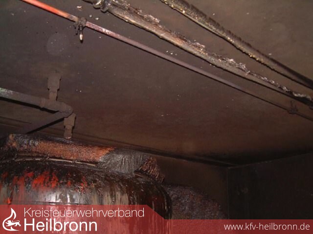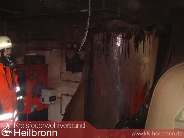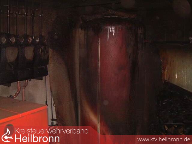 Nach dem Eintreffen des LF 8/6 der Abteilung Niederhofen, stelle sich heraus, dass das Feuer bereits von selbst weitgehend erloschen war. Das Haus war stark verraucht, bei der Wohnungsinhaberin bestand der Verdacht auf eine leichte Rauchvergiftung. Sie wurde dem zwischenzeitlich eingetroffenen Rettungsdienst übergeben, der sie zu einer ärtzlichen Kontrolle ins Krankenhaus brachte.Eine eingehende Kontrolle des Heizraums durch einen Trupp unter Atemschutz ergab, dass eine über dem Brandherd befindliche Wasserleitung durch die Hitze geplatzt war und das austretende Wasser das Feuer löschte.