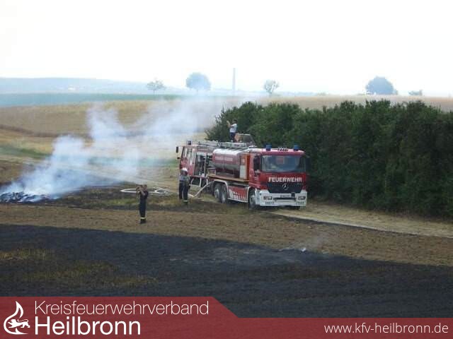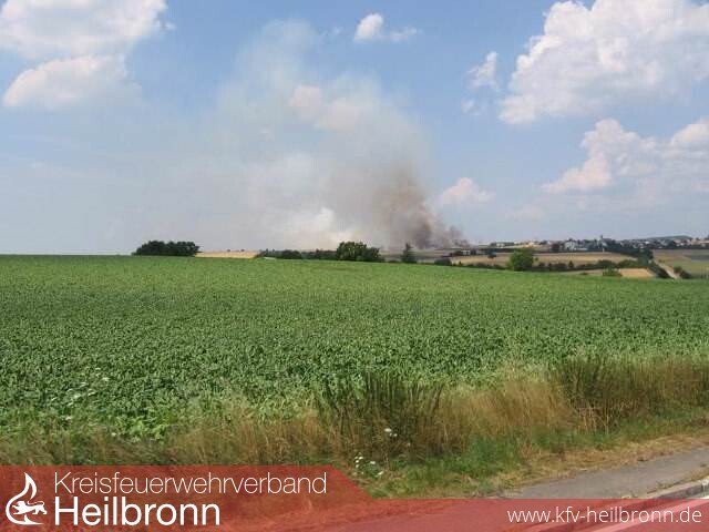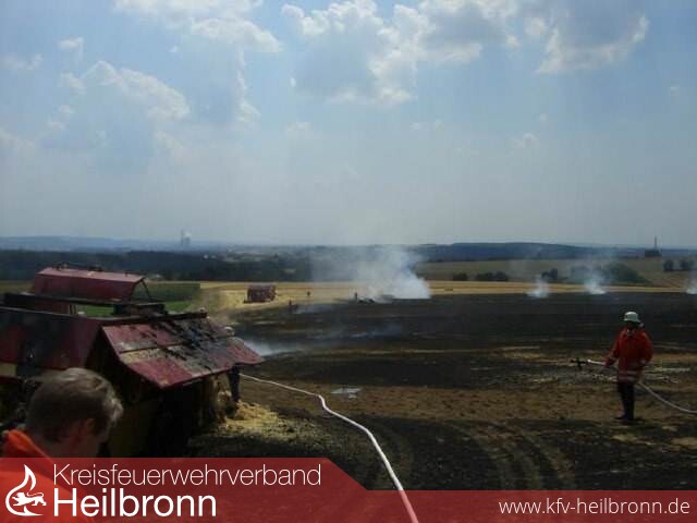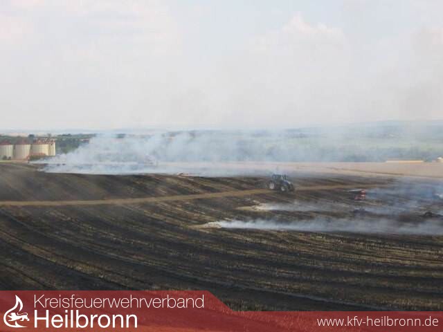 Zu einem großflächigen Brand eines abgeerntetes Getreidefeldes und Brand einer Strohpressmaschine wurde um 13.31 Uhr die Feuerwehr Gundelsheim und die Feuerwehrabteilung Obergriesheim alarmiert. Der Einsatzleiter forderte sofort ein Tanklöschfahrzeug der Feuerwehr Bad Friedrichshall zur Unterstützung an.