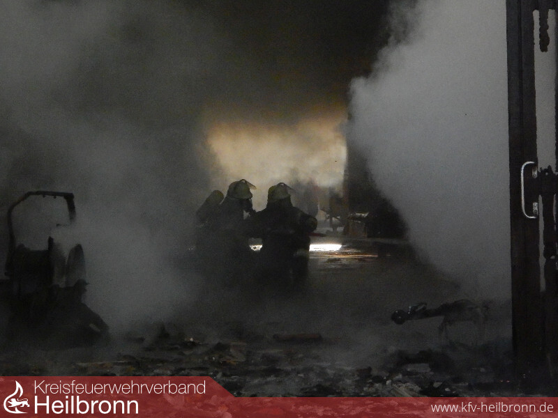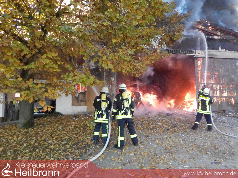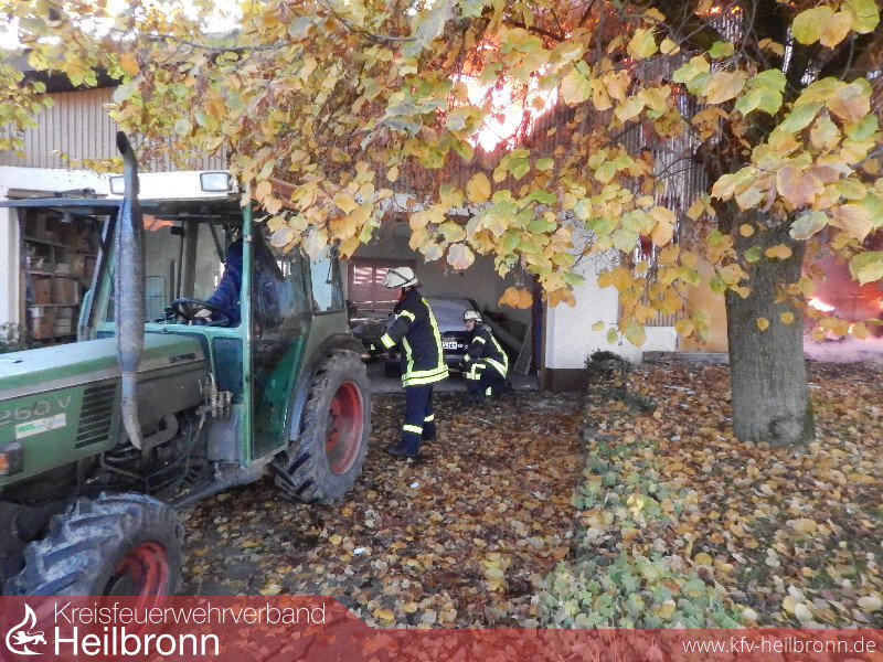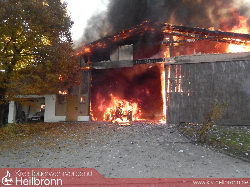 Anwohner eines Aussiedlerhofes im Nordheimer Ortsteil Nordhausen verständigten am Montagmorgen über Notruf die Feuerwehr das ein landwirtschaftliches Fahrzeug in einer Maschinenhalle brennen würde. Noch vor Eintreffen der ersten Feuerwehrkräfte griff der Brand auf weitere in der Halle abgestellte Fahrzeuge und Gerätschaften über. Daraufhin wurde umgehend die Alarmstufe erhöht und die Feuerwehren Lauffen und Heilbronn rückten mit je einem Löschzug an.