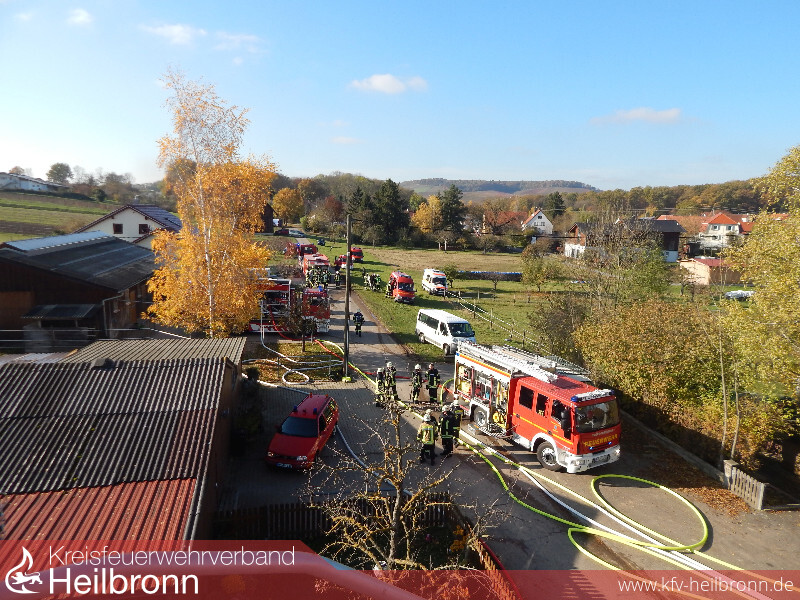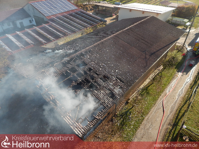 Wegen der Außenlage wurde der Abrollbehälter Tank/Wasser aus Heilbronn mitalarmiert. Später konnte mit einer verlegten Leitung Löschwasser aus dem Ortsnetz entnommen werden. Ebenso war der Abrollbehälter Atemschutz vor Ort. Die aus Neckarsulm nachgeforderte Elektrofachgruppe kontrollierte eine im Brandbereich befindliche Photovoltaikanlage auf eventuelle Schäden. Für den Eigenschutz bei den Nachlöscharbeiten wurden von der Feuerwehr Brackenheim schlussendlich noch Einmalschutzanzüge und Filtermasken nachgefordert.