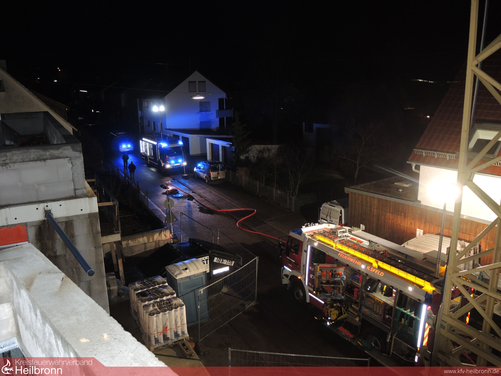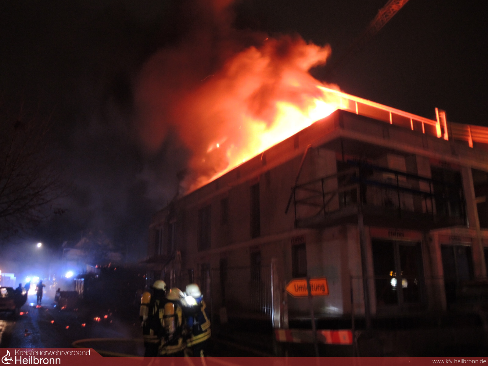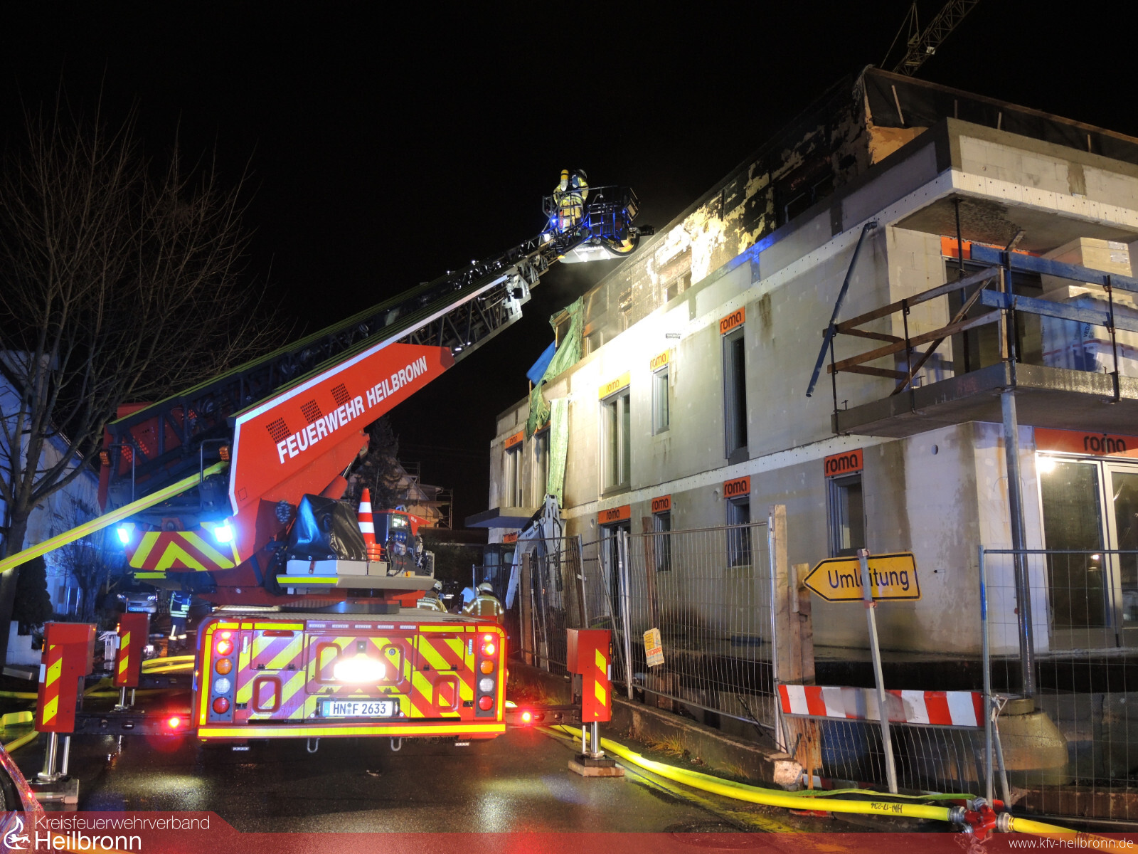 Die Leitstelle alarmierte den Löschzug Helfenberg und Ilsfeld zu einer Rauchentwicklung in einem Rohbau in der Schillerstraße in Auenstein. Beim Eintreffen der Einsatzkräfte stand die Außenfassade der Penthaus-Wohnung in Vollbrand. Sofort wurden weitere Kräfte aus Schozach und die Drehleiter aus Heilbronn nachalarmiert. Während der Ersterkundung erxplodierte eine Gasflasche auf dem Dach des Gebäudes. Die Explosion war bis in die Nachbarorte zu hören. Brennende Teile wurden in die benachbarten Gärten geschleudert. Es wurden parallel zwei Löschangriffe aufgebaut. Mit zwei B-Rohren wurde der Dachgeschossbrand von der Straße aus abgelöscht. Ein Fahrzeug kümmerte sich um die Brandbekämpfung in der Gartenanlage. Noch vor dem Eintreffen der Drehleiter wurde ein Trupp unter Atemschutz ins Gebäude geschickt. Dieser erkundete die einzelnen Stockwerke und kühlte eine weitere sich auf dem Dach befindliche Gasflasche. Mit der Drehleiter wurden der Dachbereich noch weiter kontrolliert. Außerdem wurde die Fassandendämmung entfernt und Nachlöscharbeiten durchgeführt. Das Gebäude wurde belüftet. Bereiche der Verkleidung wurden geöffnet und kontrolliert. Außerdem war die Wärmebildkamera im Einsatz um alle Bereiche zu kontrollieren. Es konnten keine weiteren Glutnester mehr gefunden werden. Die Aufräumarbeiten dauerten bis nach 22 Uhr.