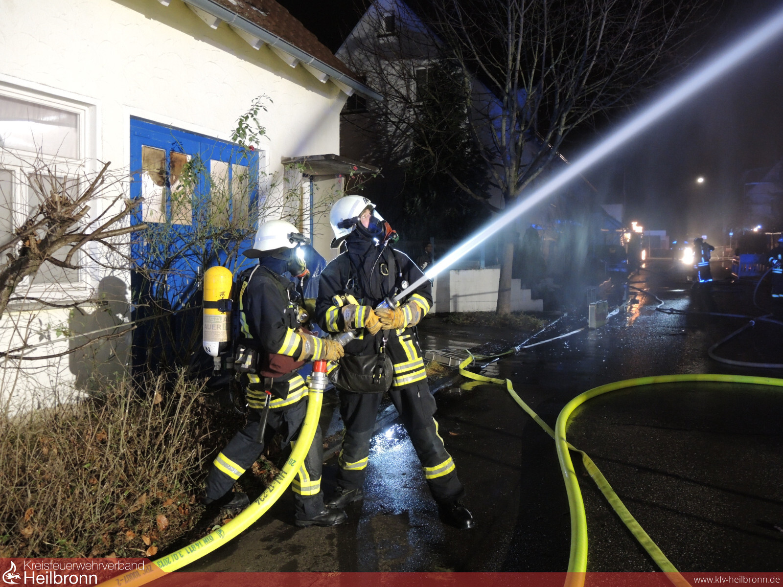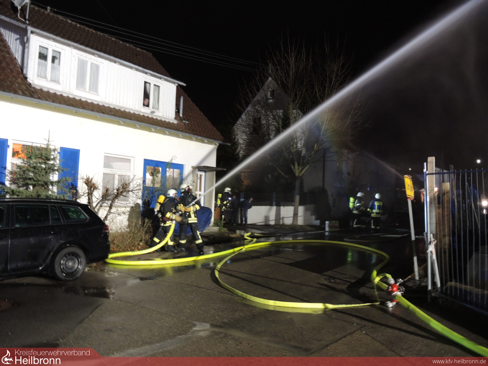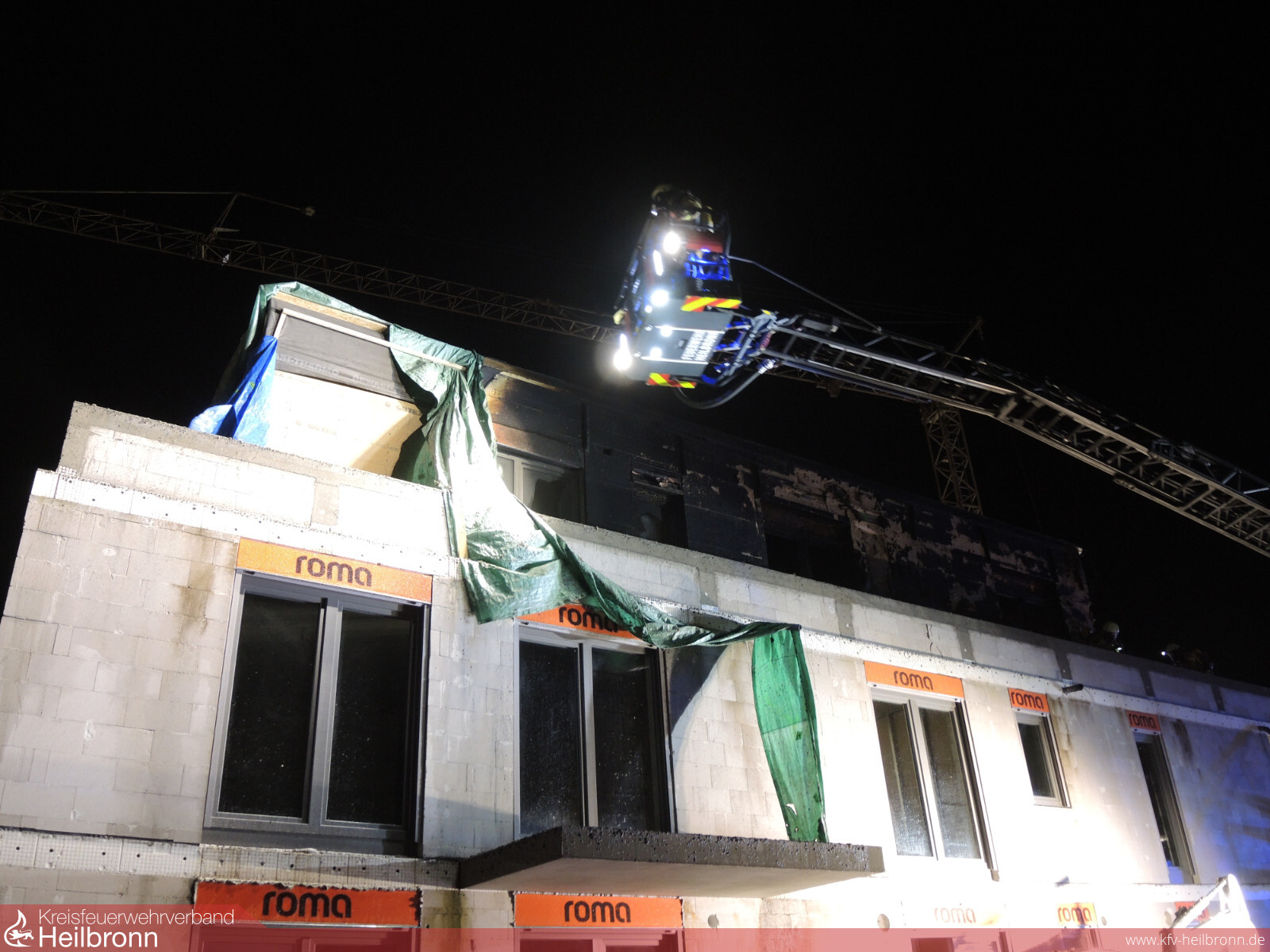 Die Leitstelle alarmierte den Löschzug Helfenberg und Ilsfeld zu einer Rauchentwicklung in einem Rohbau in der Schillerstraße in Auenstein. Beim Eintreffen der Einsatzkräfte stand die Außenfassade der Penthaus-Wohnung in Vollbrand. Sofort wurden weitere Kräfte aus Schozach und die Drehleiter aus Heilbronn nachalarmiert. Während der Ersterkundung erxplodierte eine Gasflasche auf dem Dach des Gebäudes. Die Explosion war bis in die Nachbarorte zu hören. Brennende Teile wurden in die benachbarten Gärten geschleudert. Es wurden parallel zwei Löschangriffe aufgebaut. Mit zwei B-Rohren wurde der Dachgeschossbrand von der Straße aus abgelöscht. Ein Fahrzeug kümmerte sich um die Brandbekämpfung in der Gartenanlage. Noch vor dem Eintreffen der Drehleiter wurde ein Trupp unter Atemschutz ins Gebäude geschickt. Dieser erkundete die einzelnen Stockwerke und kühlte eine weitere sich auf dem Dach befindliche Gasflasche. Mit der Drehleiter wurden der Dachbereich noch weiter kontrolliert. Außerdem wurde die Fassandendämmung entfernt und Nachlöscharbeiten durchgeführt. Das Gebäude wurde belüftet. Bereiche der Verkleidung wurden geöffnet und kontrolliert. Außerdem war die Wärmebildkamera im Einsatz um alle Bereiche zu kontrollieren. Es konnten keine weiteren Glutnester mehr gefunden werden. Die Aufräumarbeiten dauerten bis nach 22 Uhr.