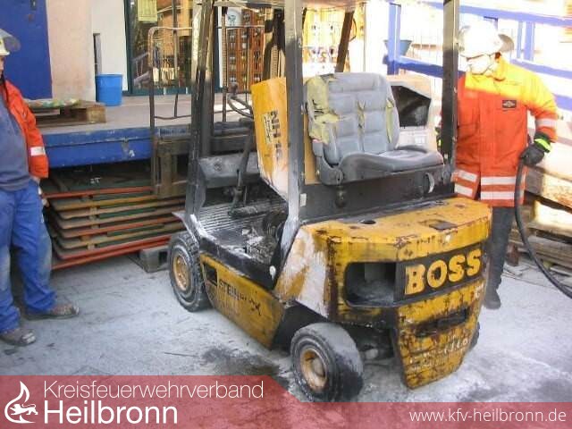 Bei der Fa. Getränkemarkt Freyer brannte auf dem Betriebshof ein mit Biertischgarnituren beladener Gabelstapler. Der Brand wurde von Betriebsangehörigen mit einem PG 12 weitgehend abgelöscht, so dass von der Feuerwehr lediglich Nachlöscharbeiten durchzuführen waren.