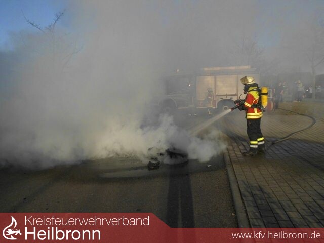 Bei deren Eintreffen stand das Fahrzeug in Vollbrand. Der Brand wurde mit einem C-Rohr unter Atemschutz gelöscht.