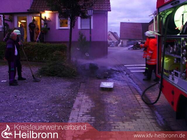 Vor einem Wohngebäude in der Lorscher Str. im Stadtteil Untergriesheim brannte ein Motorroller. Durch den Brand wurde ein Baum in Mitleidenschaft gezogen.