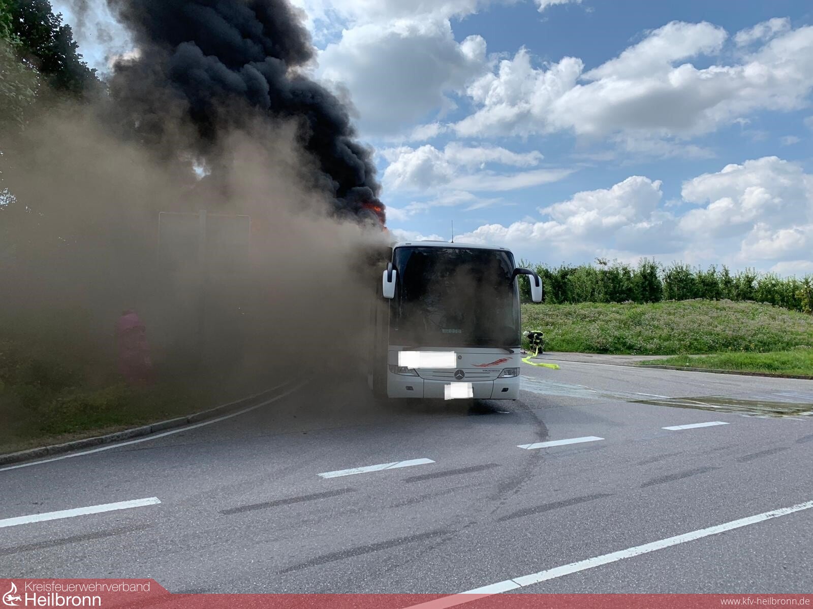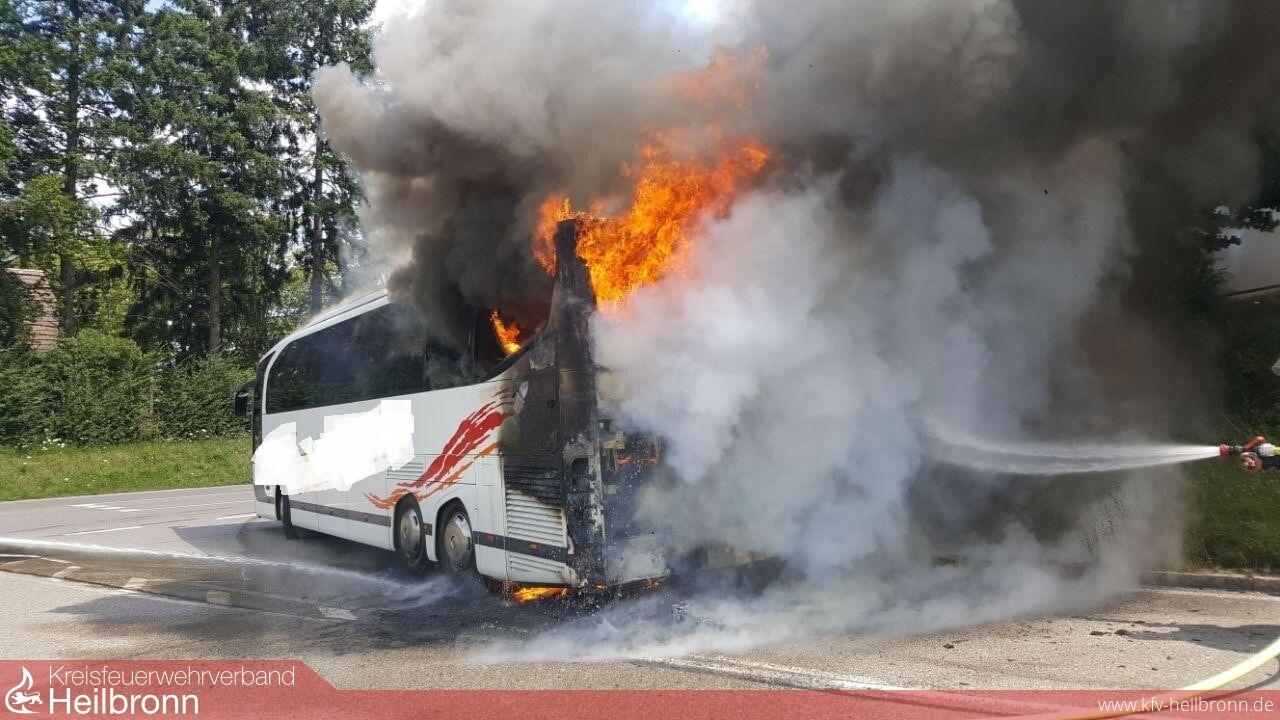 Am Montagnachmittag wurde die Feuerwehr Obersulm zu einem Brand eines Reisebusses auf die B 39 Ortsausgang Willsbach alarmiert. Die Schulklasse, Kinder die auf dem Weg zu einer Freizeit nach Murrhardt waren, konnten sich schnell in Sicherheit bringen. Noch auf der Anfahrt wurde Vollalarm für alle Abteilungen ausgelöst.