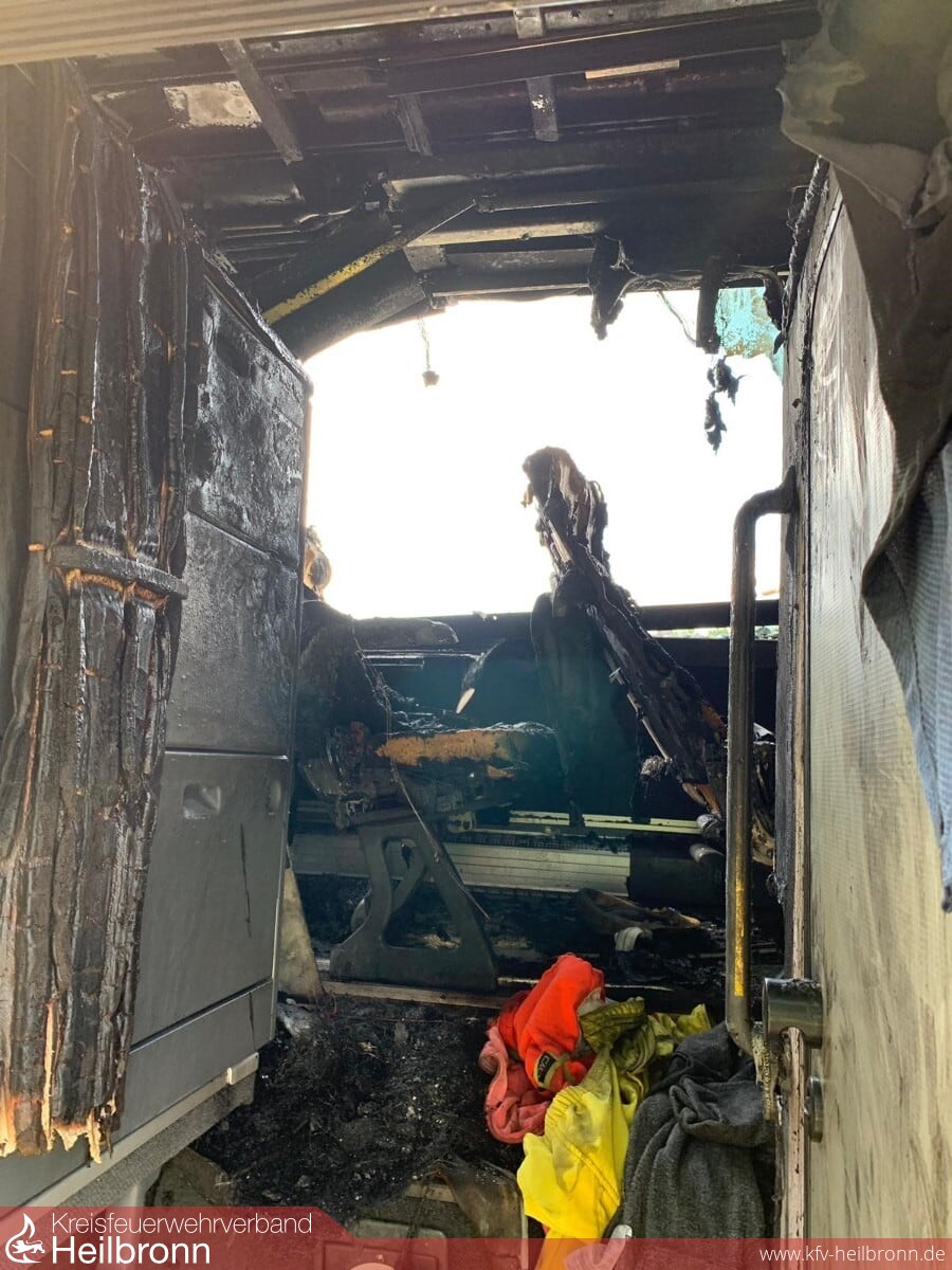 Beim Eintreffen der Obersulmer Kräfte stand der Bus im Heckbereich bereits im Vollbrand. Das HLF20 der Abteilung Obersulm 1 und das nachrückende LF20 der Abteilung Obersulm 2 führten mit drei Trupps unter Pressluftatmer und drei C-Rohren einen massiven Löschangriff durch.