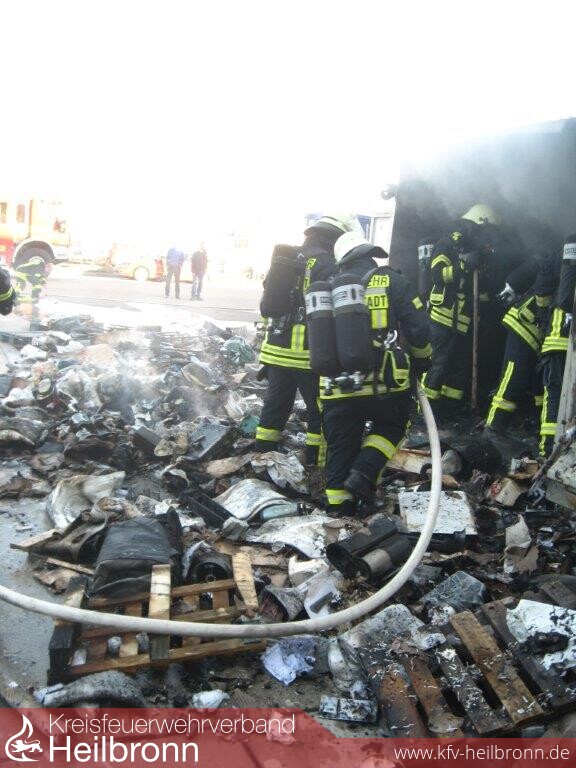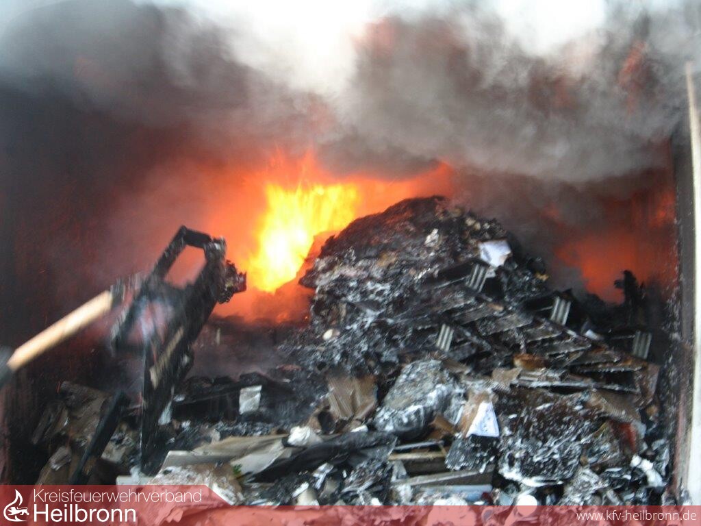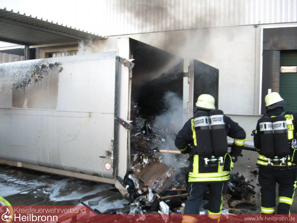 Die Feuerwehr Neuenstadt wurde mit Alarmstichwort Kleinbrand/Containerbrand mit einem Löschfahrzeug alarmiert. Am Ende waren jedoch am Ende 3 C-Strahlrohre erforderlich um den Brand zu löschen und ein Übergreifen der Flammen auf einen LKW zu verhindern. Der gesamte Inhalt der Containers musste mittels einem Radlader entleert werden, um den Restmüll vollständig abzulöschen.