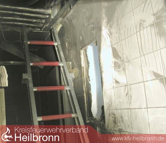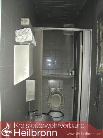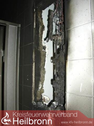 Erst bei der Kontrolle des darunter liegenden Geschosses zeigte sich die Ursache für die Verrauchung. Ein Stromverteilerkasten in der Herrentoilette eines Großraumbüros war komplett ausgebrannt. Die Außenwand zu den Büroräumen wies aufgrund der großen Hitzeeinwirkung bereits Risse auf. Zum Zeitpunkt des Brandausbruches war die Toilettentür glücklicherweise geschlossen, so dass das Feuer aufgrund von Sauerstoffmangel erstickte. Lediglich kleinere Ansammlungen von flüssigem Kunststoff brannten noch an der Wand und am Boden.