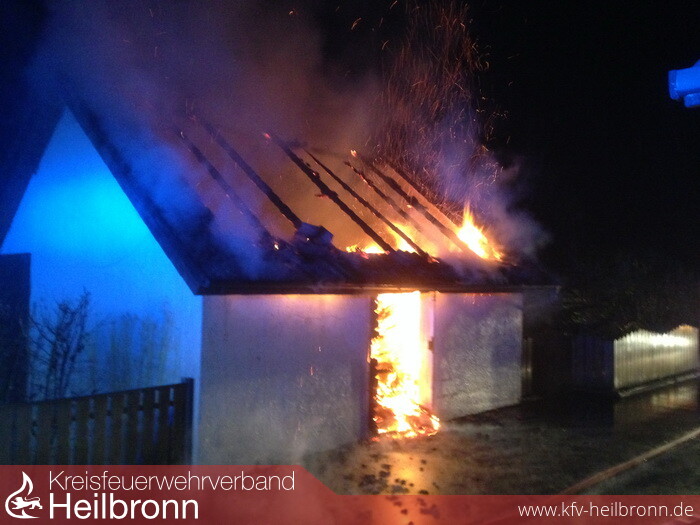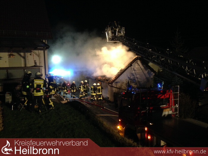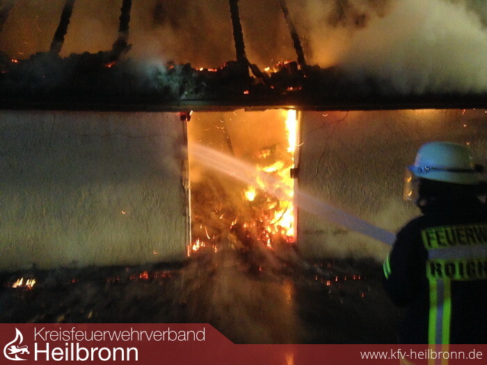 In der Nacht zum Sonntag, gegen 02.00 Uhr, kam es zu einem Gebäudebrand in der Eugen-Reichert-Straße. Der Anbau eines Wohnhauses geriet aus bislang unbekannter Ursache in Brand. In dem Anbau waren größtenteils Holz/Papierpresslinge von einer ortsansässigen Firma als Heizmaterial gelagert. Durch die enorme Hitzeentwicklung schmolz an dem gegenüberliegenden Wohnhaus die im Dachgeschoss angebrachten Fensterrolladen. An insgesamt fünf weiteren Fenstern im Erdgeschoss und im 1. OG zersprangen die Fensterscheiben. Ein Schaden am Wohnhaus selbst, das an den Anbau direkt grenzt, konnte durch das rasche Eingreifen der Feuerwehren Roigheim und Möckmühl, die mit 30 Mann im Einsatz waren, verhindert werden. Der Gesamtsachschaden wird auf etwa 90.000 Euro beziffert.