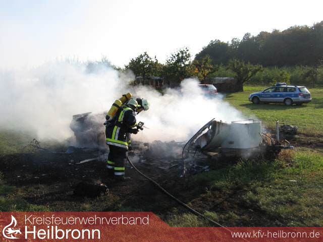 Am Sonntagnachmittag in der Zeit zwischen 16.30 Uhr und 16.45 Uhr geriet ein in Nordheim auf einem Wiesengrundstück abgestellter Wohnwagen aus bislang unbekannter Ursache in Brand. Der Wohnwagen wurde durch den Besitzer zwischen Nordheim und Brackenheim abgestellt. Trotz des schnellen Einschreitens der freiwilligen Feuerwehr Brackenheim konnte nicht verhindert werden, dass der Wohnwagen durch das Feuer komplett zerstört wurde. Der Besitzer konnte durch die Polizei in Lauffen noch nicht erreicht werden. Die Höhe des Sachschadens ist noch unbekannt. Die freiwillige Feuerwehr Brackenheim war mit drei Fahrzeugen und 17 Mann im Einsatz.