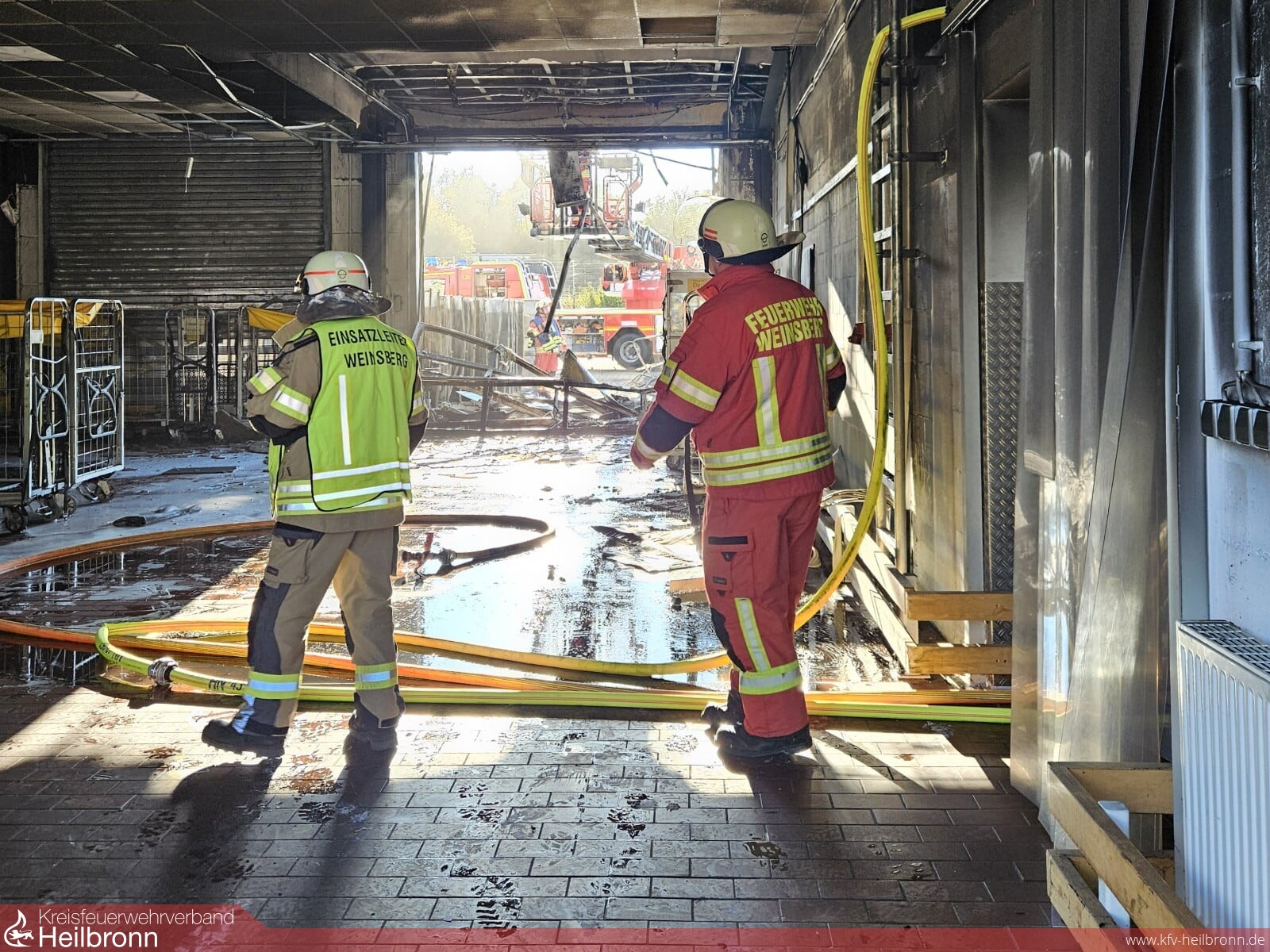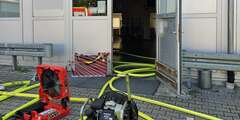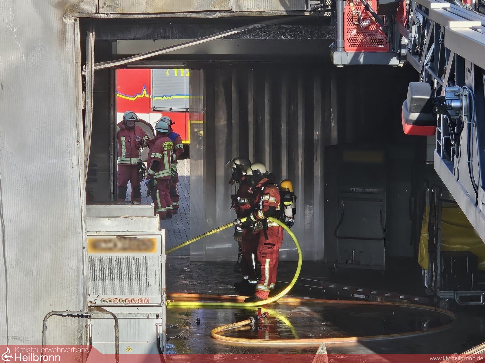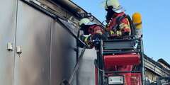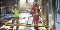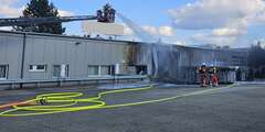 Kurz darauf drangen zwei Atemschutztrupps des zweiten Löschfahrzeugs ins Innere der zweigeschossigen Halle vor. Unter Nullsicht arbeiteten sie sich durch die Räume und konnten das Feuer im Inneren schnell eindämmen. Parallel dazu bekämpfte die Drehleiter mit dem Wenderohr die Flammen von außen. Die starke Rauchentwicklung, die über viele Kilometer zu sehen war, nahm dadurch deutlich ab.