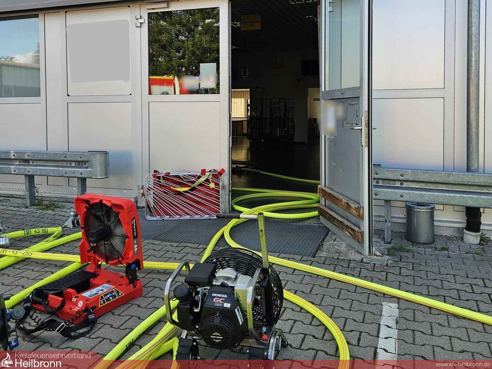 Insgesamt waren alle vier Abteilungen der Feuerwehr im Einsatz. 55 Kräfte mit 12 Fahrzeugen arbeiteten Hand in Hand. Nachdem das Feuer unter Kontrolle war, begann die Belüftung des Gebäudes. Unterstützt durch die Feuerwehr Ellbachtal mit einem SAX320-Lüfter konnte der Rauch effektiv aus der Halle abgesaugt werden.