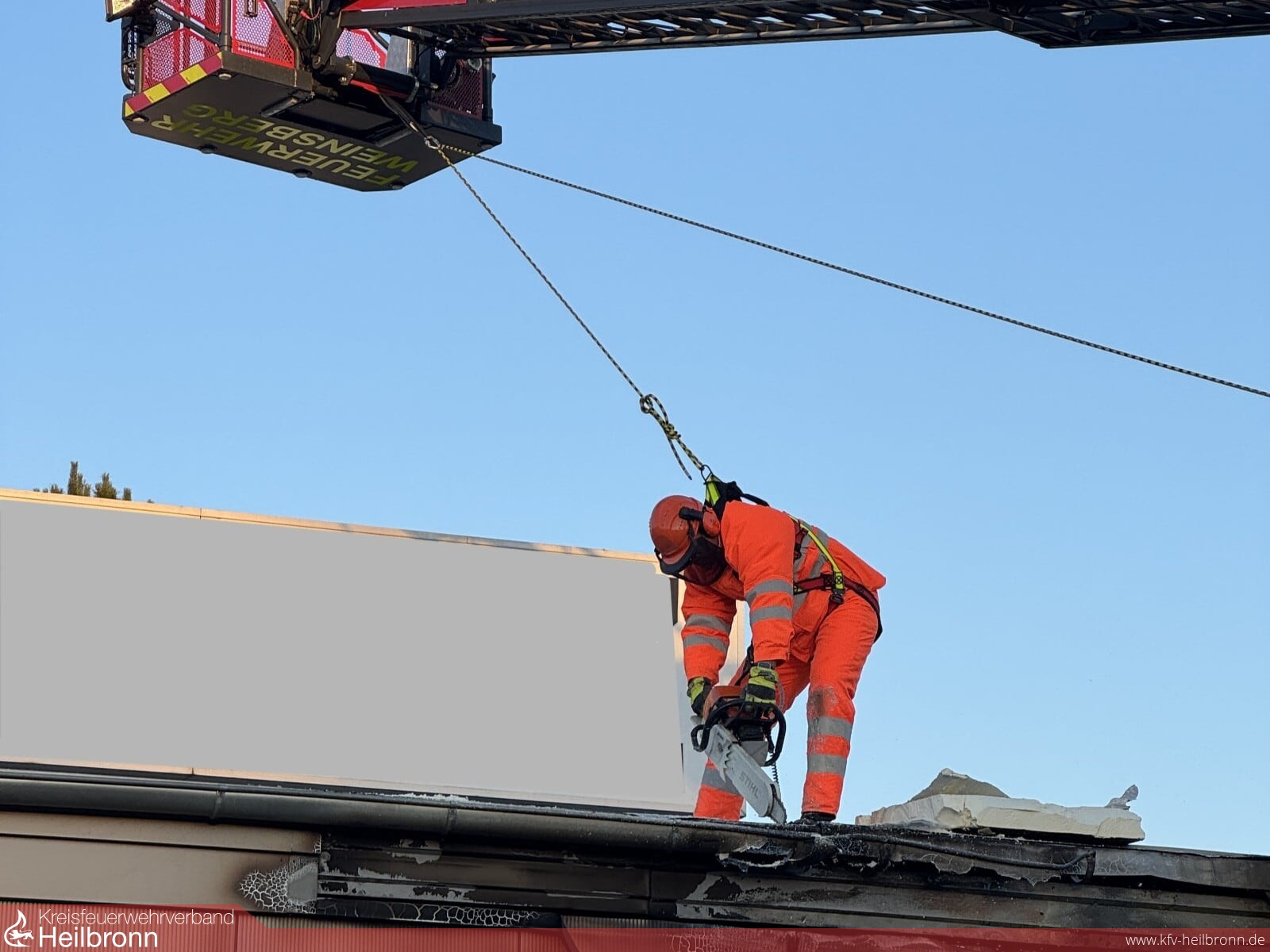 Im Anschluss an die Brandbekämpfung wurde die Drehleiter erneut eingesetzt. Mit Trennschleifer und Halligan-Tool öffneten die Einsatzkräfte die Fassade, um Glutnester aufzuspüren und kleinere Brandstellen gezielt abzulöschen. Zusätzlich kam eine Rettungssäge am Dach zum Einsatz, um auch dort versteckte Brandstellen zu erreichen.