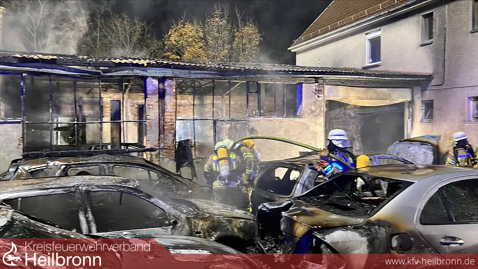 Im Zuge von Reparaturarbeiten kam es am Donnerstagabend gegen 18.00 Uhr in einer Autowerkstatt in Brackenheim zu einer Verpuffung. Das entstandene Feuer breitete sich in der gesamten Werkstatt aus und griff auf mehrere Autos über, die in und außerhalb der Werkstatt auf dem Hof abgestellt waren. Die Fahrzeuge brannten vollständig aus. Teile der angrenzenden Wohngebäude wurden ebenfalls in Mitleidenschaft gezogen. Die Wohnhäuser sind derzeit allesamt wegen des Rauches nicht bewohnbar. Die Bewohner konnten durch die Stadt untergebracht werden. Es wurde niemand verletzt. Der Gesamtsachschaden beläuft sich auf ca. 1.000.000 EUR. Das Polizeirevier Lauffen hat die Ermittlungen aufgenommen. Diese dauern hinsichtlich der Brandursache an.