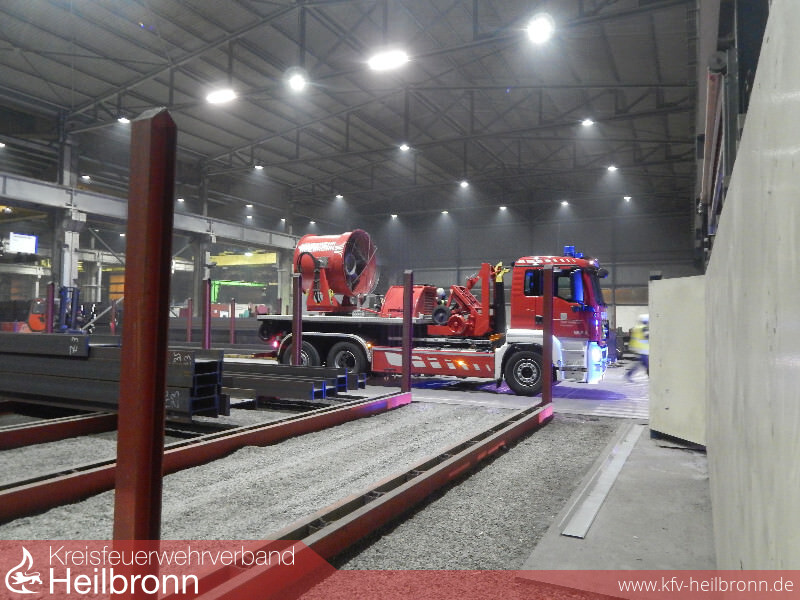 Durch die starke Rauchentwicklung wurde auch die Lagerhalle in Mitleidenschaft gezogen, weshalb aufgrund der großen Dimensionen der mobile Großventilator zur Belüftung zum Einsatz kam.