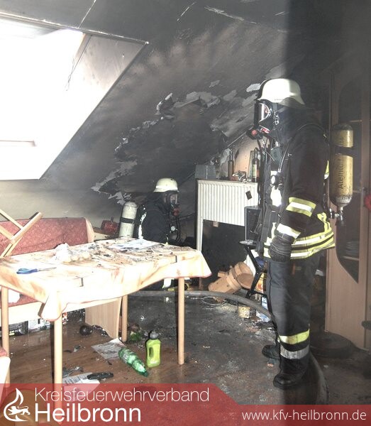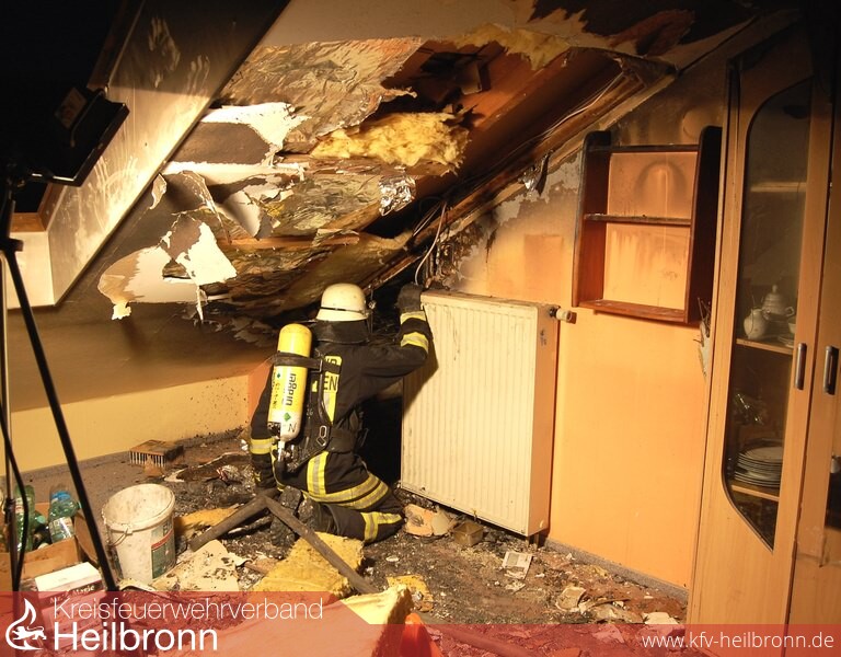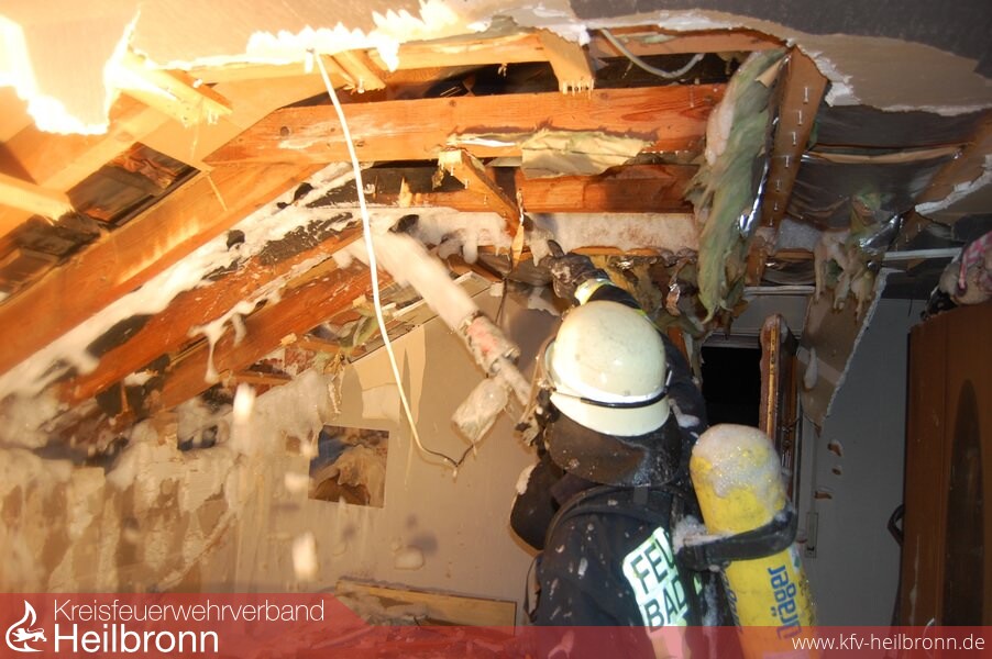 Durch den bereits aufgestellten Druckbelüfter und den Rauchvorhang an der Wohnungstür konnte das Treppenhaus rauchfrei gehalten werden. Der 2. Angriffstrupp überprüfte die gesamte Wohnung mit der Wärmebildkamera, hierbei zeigte die Wärmebildkamera hohe Temperaturen hinter der Verkleidung der Dachschräge. Da sich in diesem Bereich eine Solaranlage außerhalb auf dem Dach befand, musste mit einer Kettensäge die Deckenverkleidung auf gesägt und entfernt werden. Durch dieses Vorgehen konnten noch einige Brandnester lokalisiert und abgelöscht werden.