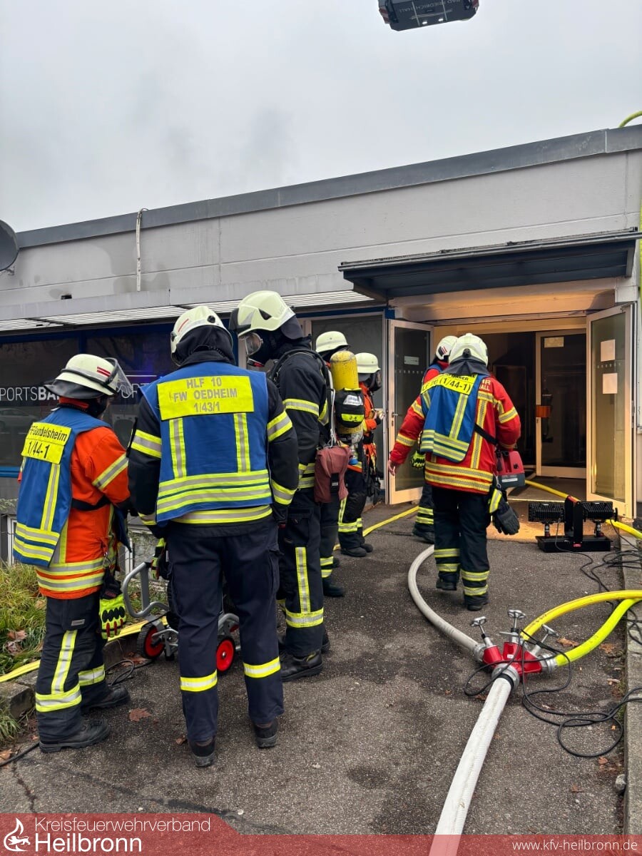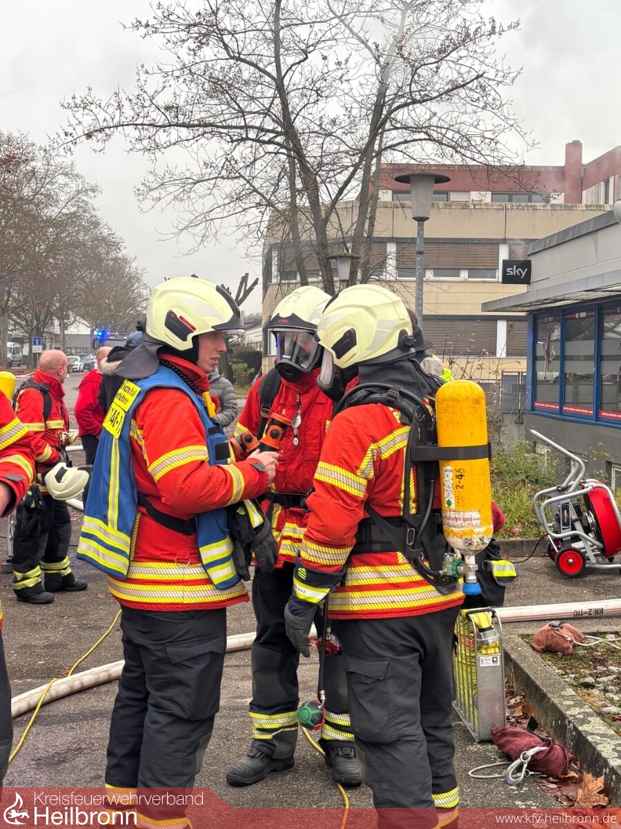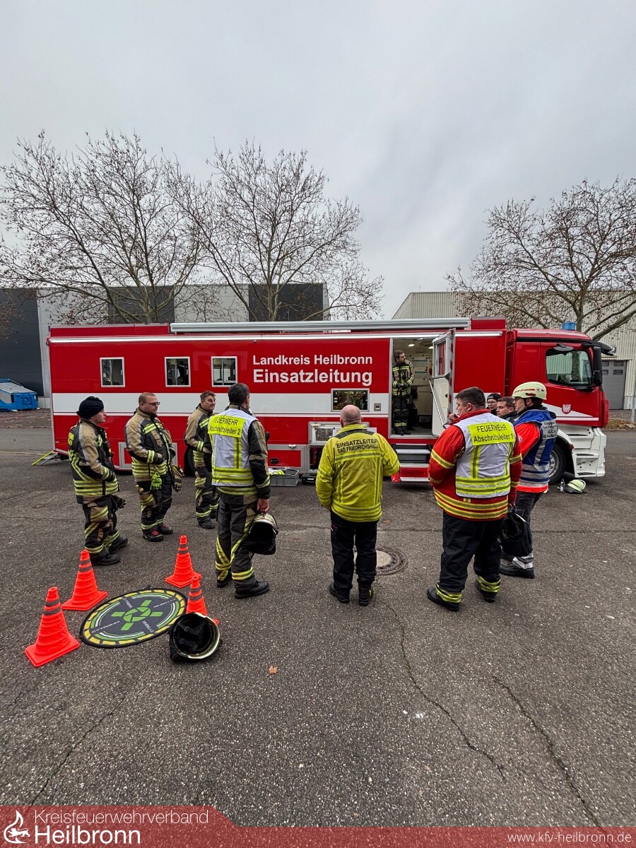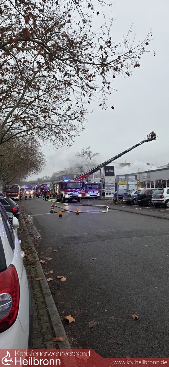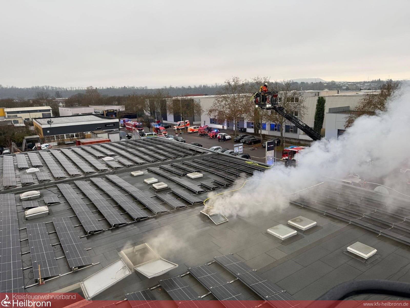 Im angrenzenden Bereich an den Brandraum sind eine Kaffeerösterei sowie eine Autowerkstatt untergebracht. Der Gebäudekomplex verfügt über keinerlei baulichen Rauch- und Brandabschnitte, was letztlich mit zu einer Ausbreitung des Rauches führte. Das Dach ist durchgängig mit einem Metalltrapezblech sowie einer Styropordämmung ausgebaut, welche ebenfalls in Brand geraten war und sich dadurch der Brand unkontrolliert ausbreiten konnte. Es wurde ein zweiter Einsatzabschnitt gebildet und diesem der Halbzug Neckarsulm zugeteilt. Beide Einsatzabschnitte wurden jeweils mit einem ELW 1 geführt und arbeiteten der Technischen Einsatzleitung, welche der ELW 2 übernommen hatte, zu. Unter großem Kräfteeinsatz und mittels Rettungssägen mussten die Decken sowohl vom Gebäudeinneren wie auch auf dem Dach geöffnet werden. Insgesamt kamen 7 C-Rohre, ein Wenderohr sowie 30 Trupps unter Atemschutz zum Einsatz. Aufgrund der starken Rauchentwicklung erfolgte eine Warnung der Bevölkerung über die WarnApp Nina, parallel hierzu wurden durch den Gerätewagen Messtechnik an der Einsatzstelle aber auch im Stadtgebiet Bad Friedrichshall Schadstoffmessung durchgeführt. Alles Messungen waren negativ, so dass eine Gefahr für die Bevölkerung bestand.