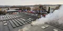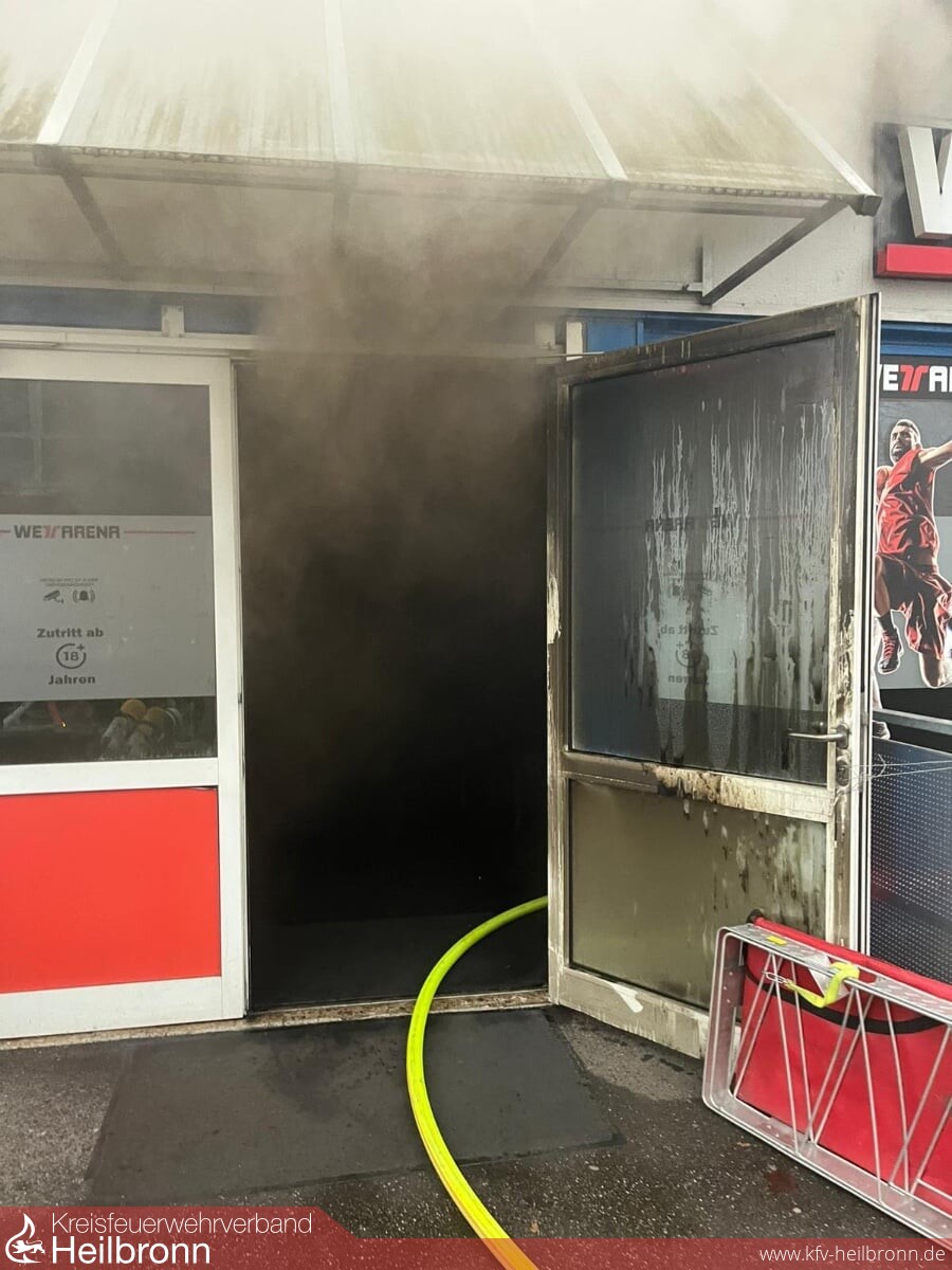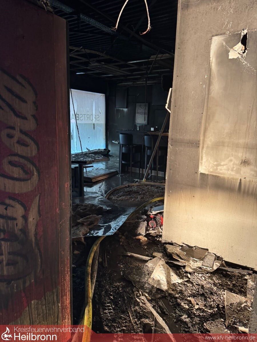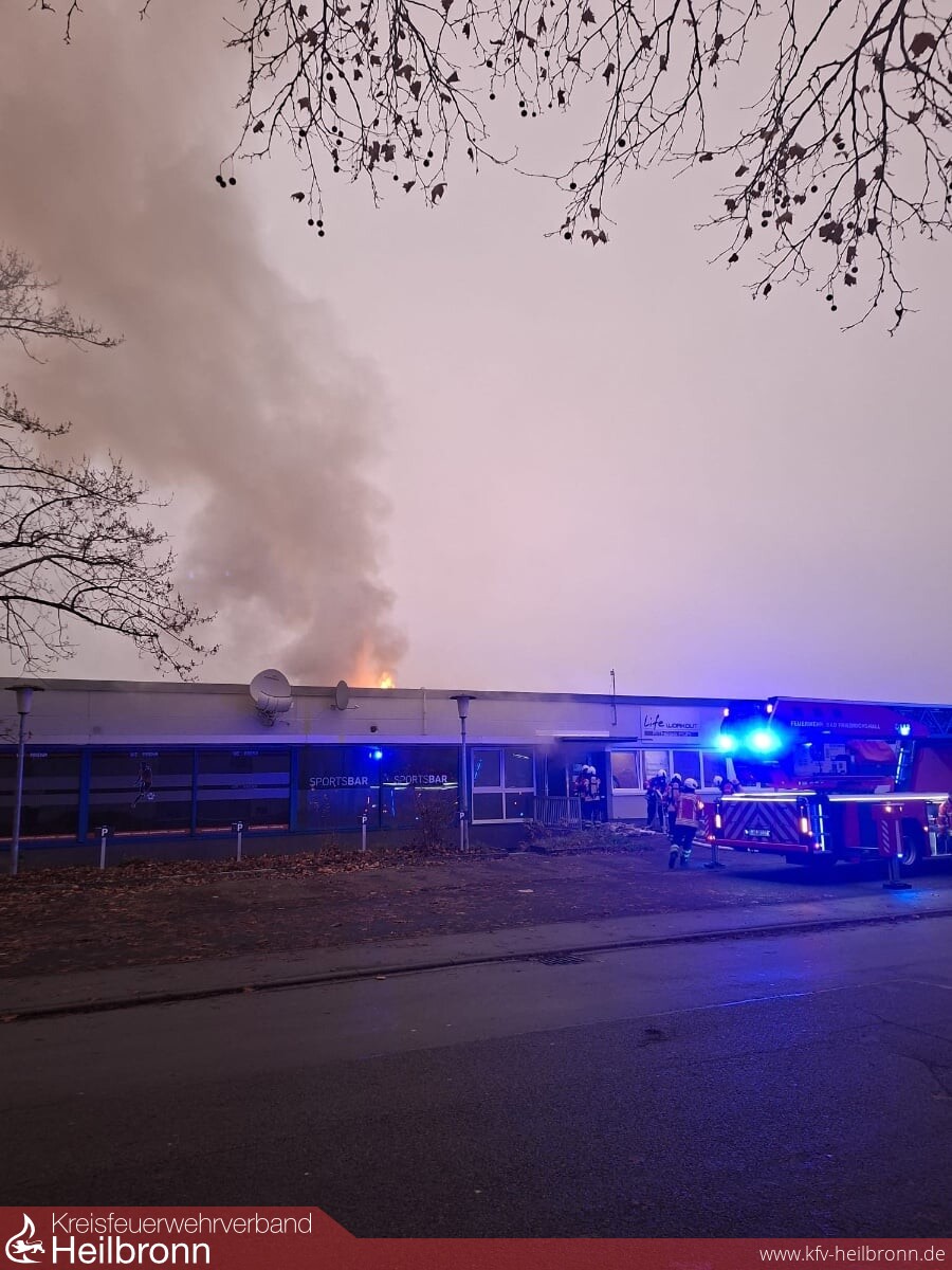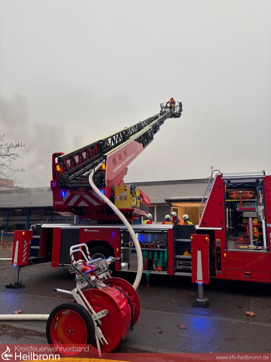 Im angrenzenden Bereich an den Brandraum sind eine Kaffeerösterei sowie eine Autowerkstatt untergebracht. Der Gebäudekomplex verfügt über keinerlei baulichen Rauch- und Brandabschnitte, was letztlich mit zu einer Ausbreitung des Rauches führte. Das Dach ist durchgängig mit einem Metalltrapezblech sowie einer Styropordämmung ausgebaut, welche ebenfalls in Brand geraten war und sich dadurch der Brand unkontrolliert ausbreiten konnte. Es wurde ein zweiter Einsatzabschnitt gebildet und diesem der Halbzug Neckarsulm zugeteilt. Beide Einsatzabschnitte wurden jeweils mit einem ELW 1 geführt und arbeiteten der Technischen Einsatzleitung, welche der ELW 2 übernommen hatte, zu. Unter großem Kräfteeinsatz und mittels Rettungssägen mussten die Decken sowohl vom Gebäudeinneren wie auch auf dem Dach geöffnet werden. Insgesamt kamen 7 C-Rohre, ein Wenderohr sowie 30 Trupps unter Atemschutz zum Einsatz. Aufgrund der starken Rauchentwicklung erfolgte eine Warnung der Bevölkerung über die WarnApp Nina, parallel hierzu wurden durch den Gerätewagen Messtechnik an der Einsatzstelle aber auch im Stadtgebiet Bad Friedrichshall Schadstoffmessung durchgeführt. Alles Messungen waren negativ, so dass eine Gefahr für die Bevölkerung bestand.