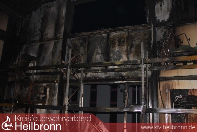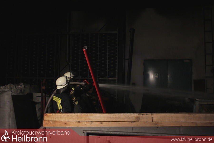 Um Löscharbeiten im Bereich der Maschinenhalle durchführen zu können, musste zuvor das Hallentor mit schwerem Gerät aufgesägt werden um einen Zugang zu erhalten. Der Bürobereich im Gebäude, welcher auch verraucht war, konnte über die Gebäuderückseite durch die Feuerwehr Eppingen erkundet und abschließend belüftet werden. Durch die Drehleiter der Lauffener Wehr wurde eine Riegelstellung zum Schutz des angrenzenden Autohauses gestellt, während durch die Kräfte der Heilbronner Drehleiter ein Löschangriff über das Dach erfolgte. Erschwerend gestaltete sich die Wasserversorgung durch den vorhandenen Wasserdruck im Industriegebiet, weshalb umgehend eine Druckerhöhung beim Wasserversorger angefordert worden ist. Unterstützend wurde mit dem Schlauchwagen eine doppelte Schlauchleitung vom Hydranten an der angrenzenden Landstraße verlegt. Hierzu musste die Landstraße über einen längeren Zeitraum für den Verkehr gesperrt werden.