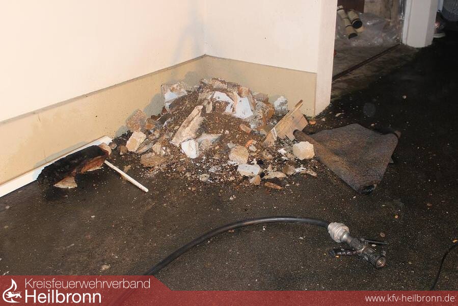 Mit einem C-Rohr und Kleinlöschgerät wurde das Feuer gelöscht. Um die weitere Rauchausbreitung im EG und OG zu vermeiden, wurden insgesamt drei Rauchvorhänge eingesetzt. Im OG wurde um den Kamin herum der Bodenbelag kleinflächig geöffnet, um auch diesen Bereich kontrollieren zu können. Insgesamt wurden für die Arbeiten im Gebäude mehrere Trupps unter Atemschutz eingesetzt.. Mit der Wärmebildkamera wurden die betroffenen Bereiche fortlaufend immer wieder kontrolliert. Zudem wurde ein örtlicher Schornsteinfeger hinzugezogen. Als die Lage abschätzbar war, konnten DLK und TLF wieder die Rückfahrt zum Feuerwehrgerätehaus antreten.
