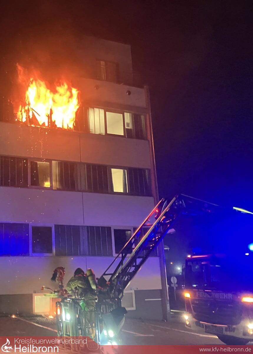 Heute Morgen gegen 02.19 Uhr wurde Feuerwehr Heilbronn über eine Brandmeldeanlage zur Flüchtlingsunterkunft in die Neckargartacher Straße alarmiert. Kurz darauf betätigten die ersten Anrufer der Leitstelle für Feuerwehr und Rettungsdienst über die 112 einen Zimmerbrand im dritten Obergeschoss des Wohngebäudes. Beim Eintreffen an der Einsatzstelle hing der Bewohner des sich in Vollbrand befindlichen Zimmers bereits an der Fensterbrüstung und schrie um Hilfe. Dieser konnte durch den schnellen Einsatz der Drehleiter im letzten Moment gerettet und in eine Klinik eingeliefert werden. Weitere 9 Bewohner mussten ebenfalls mit Drehleitern sowie durch Trupps unter Atemschutz im Innenangriff aus den verrauchten Zimmern gerettet werden. Insgesamt waren ca. 100 Personen betroffen.