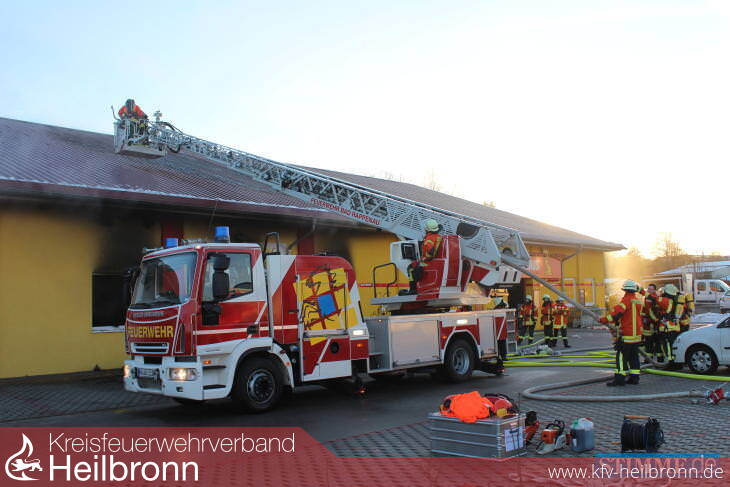 Die Dachkonstruktion aus Nagelplattenbindern verzögerte zunächst den Innenangriff, da diese Art der Dachkonstruktion sehr schnell bei Brandeinwirkung versagt. Da jedoch keine Beeinträchtigung vorlag, konnte der Brandherd dann rasch durch einen Trupp gelöscht werden. Durch den hohen Bedarf an Atemschutzgeräten, wurde der Abrollbehälter Atemschutz der Berufsfeuerwehr Heilbronn alarmiert.