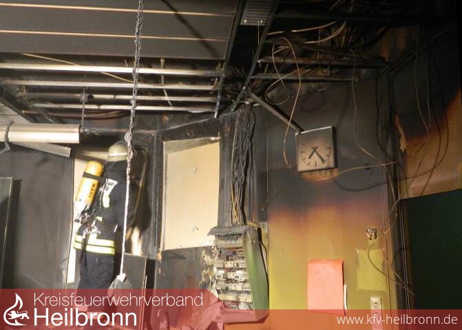 Über die Brandmeldeanlage einer Realschule wurde die Feuerwehr Heilbronn gegen 19.23 Uhr in die Max-von-Laue-Straße gerufen. Dort war vermutlich durch unsachgemäß entsorgten Abfall in einem Müllbehälter ein Brand ausgebrochen. Beim Eintreffen der Feuerwehr hatte der Brand bereits auf die umliegenden Einrichtungsgegenstände übergegriffen. Auch ein Stromverteilerkasten sowie die abgehängte Decke und die Holzverkleidung der Wände waren bereits stark in Mitleidenschaft gezogen worden.