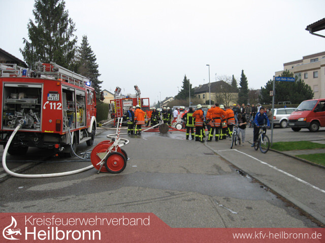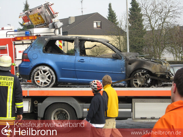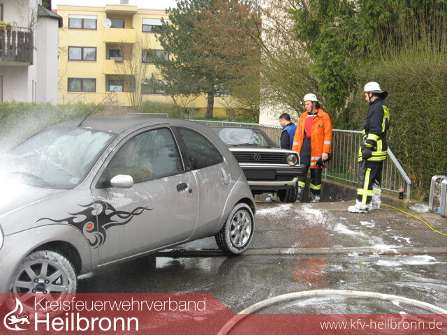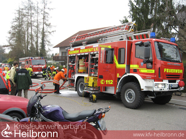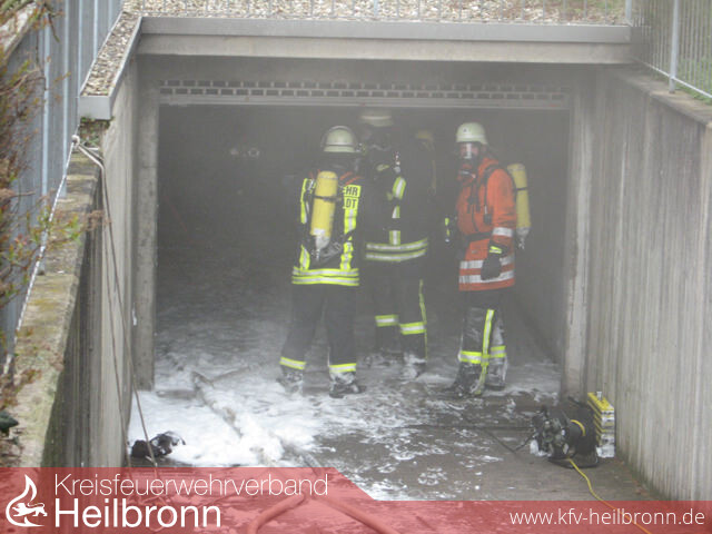 Zu einem Feueralarm wurde die Neuenstädter Wehr am Sonntag Nachmittag um 15:58 Uhr alarmiert. Schon beim Eintreffen an der Einsatzstelle drangen starke Rauchwolken aus dem Gittertor einer Tiefgarageneinfahrt, Flammen züngelten immer stärker hervor. Die derzeitige Lage war völlig unklar. Laut Übermittlung befand sich noch eine frisch operierte, gehunfähige Person im Gebäude. Aufgrund der Anzahl der benötigten Atemschutzgeräteträger bei einem Tiefgaragenbrand folgte eine Vollalarmierung, zusätzlich wurde zur Unterstützung noch die Feuerwehr Neckarsulm nachalarmiert. Der Angriffs- sowie der Wassertrupp des Hilfeleistungslöschfahrzeuges drang gewaltvoll durch das verschlossene Gittertor in die Tiefgarage ein, während weitere Trupps von einem Lichtschacht aus einen Schaumangriff vorbereiteten. Ein Personenkraftwagen hinter einer Betonmauer stand in Flammen. Es war unklar, ob sich die Brandschutztür zum Treppenaufgang in verschlossenem Zustand befand, da Rauch aus den Fenstern einer oben liegenden Wohnung des Mehrfamilienhauses drang. Aussagen zufolge sollte das brennende Fahrzeug einen vollen Tank sowie zusätzliche Reserve-Kraftstoffkanister im Kofferraum beinhalten. Nachdem sich die vermisste Person außerhalb der Tiefgarage kenntlich machte, konnten sich die zahlreichen Atemschutztrupps voll auf die Brandbekämpfung konzentrieren. Zur Unterstützung wurden hierzu zwei Überdruckbelüfter im Treppenhaus positioniert, dadurch konnte die Sichtweite schnell optimiert werden. Durch den wirksamen Einsatz des mobilen Rauchvorhanges wurde die Rauchausbreitung in den Wohnbereich deutlich reduziert. Aufgrund des Einsatzes zahlreicher Feuerwehrleute konnte der Brand schnell unter Kontrolle gebracht werden. Nachdem die Tiefgarage bald entraucht war konnten die völlig verdreckten darin befindlichen Fahrzeuge durch deren Eigentümer ausgeparkt und zu einer Waschanlage gefahren werden. Zum Entfernen des Brandfahrzeuges war ein Abschleppwagen notwendig, zuvor musste das Fahrzeug um eine Ecke gezogen werden. Zahlreiche Schaulustige verfolgten den Einsatz, verletzt wurde glücklicherweise niemand. Die Brandschau erfolgte durch Kreisbrandmeister Vogel. Die Kommandanten Jochim und Schaffroth äußerten sich sehr positiv über den Einsatzablauf und die taktische Vorgehensweise.
