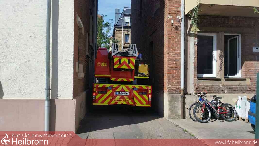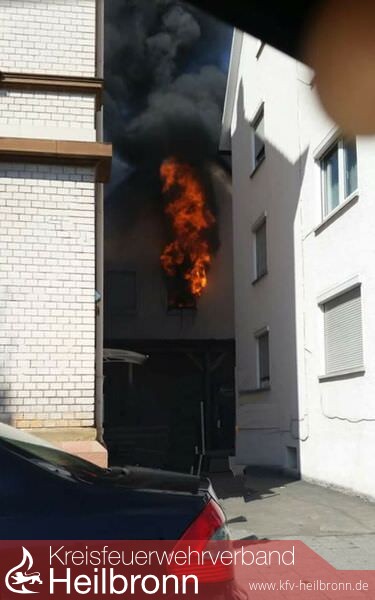 Bereits auf der Anfahrt war eine deutliche Rauchsäule erkennbar. Vor Ort schlugen Flammen aus mehreren Fenstern im ersten Obergeschoss eines dreistöckigen Wohngebäudes heraus.