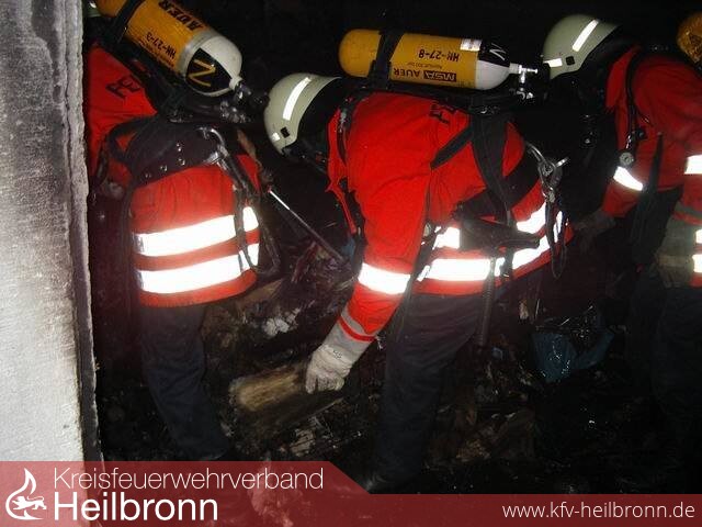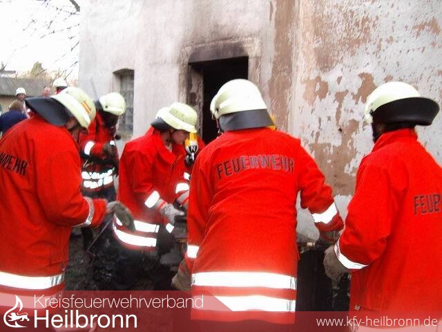 In einer Scheune entstand aus bisher ungeklärter Ursache ein Brand. Das Feuer wurde sehr spät entdeckt, so dass der seperat abgemauerte Raum beim Eintreffen der Einsatzkräfte schon im Vollbrand stand. Die starke Hitzeentwicklung setzte einen über dem Eingang befindlichen Bretterverschlag ebenfalls leicht in Brand. Zugang zu dem Raum war lediglich durch eine schmale Türe möglich, so dass mit nur einem C-Rohr die Brandbekämpfung durchgeführt werden konnte.
