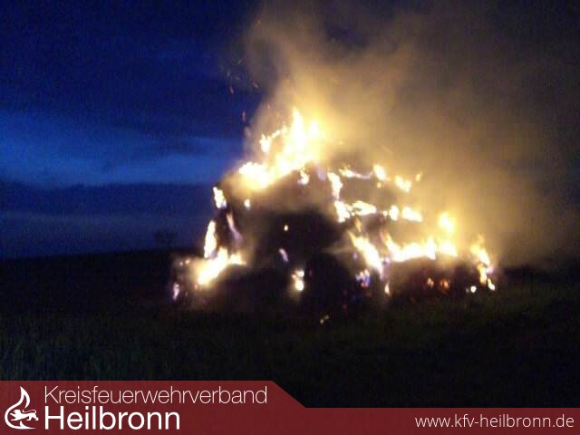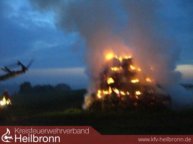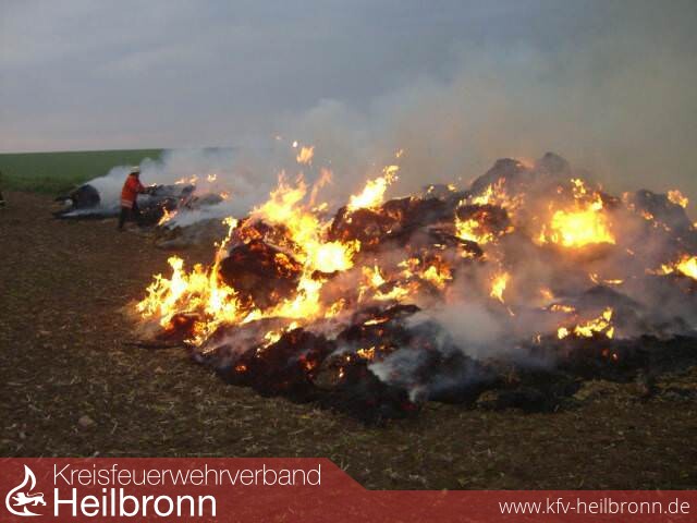 Diesmal hat sich ein Brandstifter ein Strohlager im Bereich Oedheimer Berg ausgesucht. Ca. 50 aufgestapelte Rundstrohballen standen in Vollbrand.