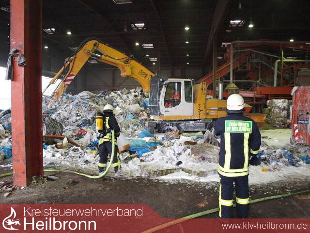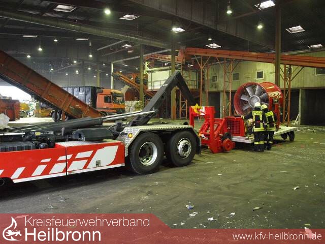 Dem schnellen und massiven Einsatz der Feuerwehr ist es zu verdanken, dass sich ein Brand in einer Heilbronner Entsorgungsfirma nicht weiter ausbreiten konnte. Alarmiert über die Brandmeldeanlage rückten die ersten Einsatzfahrzeuge gegen 10.12 Uhr zum gemeldeten Objekt aus. Noch während der Anfahrt des Löschzuges bestätigte ein Firmenmitarbeiter der Feuerwehrleitstelle telefonisch einen Brand in einer Sortierhalle auf dem Betriebsgelände. Sofort wurde ein weiteres Löschfahrzeug sowie zwei Wechselladerfahrzeuge mit den Abrollbehältern „Sonderlöschmittel“ und „Mobiler Großventilator“ zur Einsatzstelle entsandt.